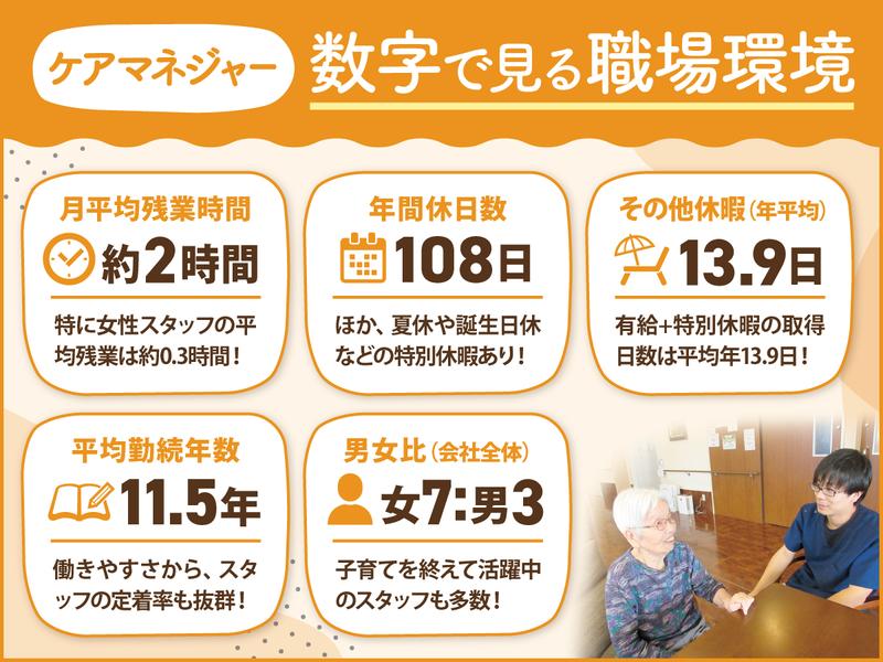 職種/仕事内容 | 仕事内容 各種手当充実!ワークライフバランスも抜群 *産休・育休取得実績あり! *産休・育休からの復帰実績100%継続中! 育児支援制度充実で女性活躍中の職場です。 *研修制度充実! 資格取得支援制度で更なる取得も目指せる! 個人のキャリアアップを応援します。 ******************************** 《仕事内容》 グループホームにおいて 入居者様(9名)が施設内で快適に 過ごすためのケアプラン作成、 介護認定の更新・変更手続き、 要介護認定申請を行います。 また、介護業務との兼務をお願いします。 ケアプラン作成時間と介護の時間を分けて それぞれの業務を勤務時間内で行います。 ------------------ \\子育てママ・パパ活躍中!// ・Aさん(女性) 今年5月、育休を終え時短復帰! お子さんのお迎えができる 「9:00~16:00」勤務で活躍中! ・Bさん(男性) 今年6月よりパパ育休を取得! 子育てと仕事の両立を会社をあげて 応援しています*。・ \\女性が活躍中の職場!// 施設の男女比率は 女性7:男性3 新卒の10代~、子育て中の20・30・40代、 子育てを終えて活躍する50・60代活躍中! ながーく働き続けられる職場です。 *家事との両立可能! *ワークライフバランスがとれるから ライフステージが変わっても続けられる! ------------------- 《居宅介護複合施設 うるしばら》 当施設は、【介護付有料老人ホーム】 【グループホーム】【デイサービス】 の3つの事業を行う複合施設です。 足利山河に囲まれ、四季の移ろいを感じ、 豊かな環境でのんびりお過ごし頂けます。 各々の医師の医療支援、専門の介護・看護 スタッフのサポートにより、利用者様が 安心して暮らせる支援を行っております。 |