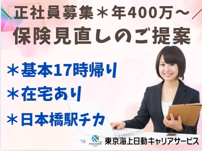 職種/仕事内容 | 仕事の内容 東京海上日動あんしんコンサルティング株式会社での企業向けの生損保営業と事務になります。 なお本求人は職業紹介事業者である株式会社東京海上日動キャリアサービスによる紹介案件です。 \新プロジェクトに伴う3名増員/ ◆年収400万〜ほぼ残業なしでも収入○ ◆在宅&フレックスでフレキシブルに♪ ◆基本的に17時定時で帰れます @日本橋 【企業向けの生損保営業〜事務】 ・補償内容見直しのご提案 ┗(新規開拓はありません) ・問合せ対応 ・見積作成〜契約締結の手続き など ○種目:自動車(7割)火災(3割) ○商品:東京海上日動メインメイン 【登用後は…】 ・年収400万以上&昇給・賞与あり └ご経験によりそれ以上にも! ・年間休日120日&時間休あり ・フレックスタイムあり └7〜11時開始の実働7h ・週1程度の在宅OK ・確定拠出年金制度あり 【環境面等】 @日本橋駅チカの高層ビル♪ └三越前駅や茅場町駅もスグ! ・30代・40代の多い職場 ・ランチタイムは休憩スペース利用OK ・オフィスカジュアル内で服装自由 ・リモートワーク実施中 (現在は週1日程度/Wifi・PC貸与) ・平日のみOK!土日祝休み ・年間休日120日以上&休暇申請OK ○●嬉しいPOINTたくさん!●○ ・正社員でも転勤なし!U・Iターン歓迎です ・複数駅歩5分以内!ランチ環境○の日本橋エリア ・ブランクOK!主婦・主夫活躍中です ・基本17時退社!ほぼ残業なしでムリなく両立 ・時差出勤OK!時間休制度もあり学校行事との調整も○! |
