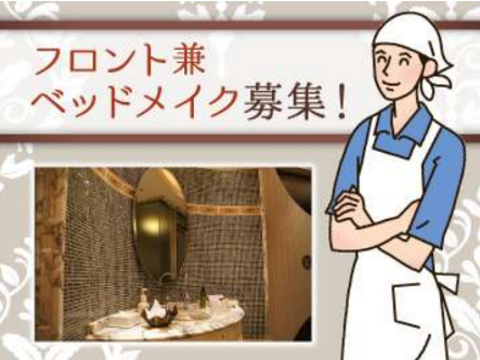 職種/仕事内容 | 仕事内容 フロント業務とベッドメイクをお任せします。 対面接客はほぼナシの裏方作業です。 ◆アピールポイント ー *Wワーク・学業との両立OK!夕方からの時間を有効に使えます♪ *未経験からも始められるお仕事です!先輩スタッフが一緒にいるのでご安心ください!スタッフ同士の仲も良いですよ♪ *マニュアル完備!マニュアルに記載の通りお仕事を進めていただければ難しいことはありません。 *モクモクと裏方で穏やかに働きたい方におすすめ!対面やお客様とのやり取りは少ないです! ◆具体的なお仕事内容 ー *電話でのお客様対応 *ベッドメイク *清掃(室内、浴室の清掃、アメニティ補充など) 難しい業務はないので、バイト未経験でもすぐに活躍可能ですよ♪ 2~3名のチーム制で作業するので、わからないことはすぐに相談できる環境です! |