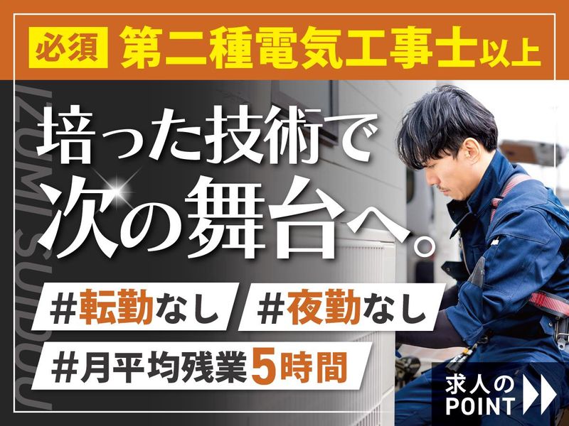 対象となる方 | 求めている人材 《経験者歓迎/ミドル世代応援》 これまでに身に付けた経験を活かして、 更なるスキルアップを目指しませんか? 【必須】 ・普通自動車免許(AT限定可) ・第二種電気工事士 【下記の有資格者も歓迎】 ・第一種電気工事士 ・2級施工管理技士 【こんな方におすすめ】 ・安定性を重視した転職をしたい >>創業以来、黒字経営を継続中! ・自分の時間、家族との時間を確保したい >>夜勤なし&残業月平均5h! ・定年退職後も働き続けたい >>再雇用制度あり。長く働ける環境! *経験者歓迎*ブランクOK(ブランク歓迎) *学歴不問 |