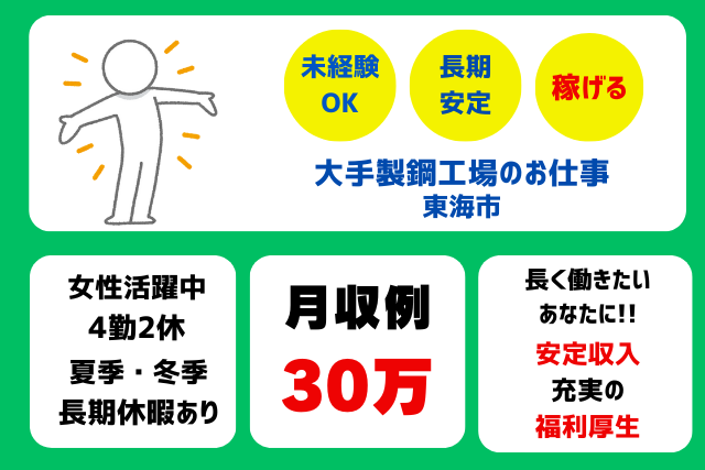 職種/仕事内容 | 仕事内容 / 高時給で簡単・単純作業! 未経験から始める 工場内検査・タグ付けスタッフ募集★ \ 高時給で働ける魅力的なお仕事のご案内です! 工場内で、コンベアから流れてくる棒状の鋼材(製品)の検査とタグ付けをお任せできる新しい仲間を募集しています。 ■お仕事内容の詳細■ あなたにお任せするのは、製鋼工場内の小さな建物内での検査とタグ付け作業です。 ◎製品の傷チェック コンベアで流れてくる棒状の鋼材に、傷や異常がないかを慎重に確認します。 ◎バーコード読み込みとタグ貼り付け 問題がなければ、製品のバーコードを読み込み、対応するタグを正確に貼り付けます。 この作業は、製品の品質を保証するための重要な工程です。 工場内ではありますが、専用の建物内での作業となるため、外部の騒音などに邪魔されることなく、自分の仕事に集中して黙々と取り組める環境です。 _______________ ◆力仕事なし!体力も心配不要!  ̄ ̄V ̄ ̄ ̄ ̄ ̄ ̄ ̄ ̄ ̄ ̄ ̄ ̄ 「工場勤務は力仕事が多いのでは?」 と心配される方もいらっしゃるかもしれません。 しかし、このお仕事は力仕事がありません! 工場全体では重量のある製品を扱いますが、あなたの担当は検査とタグの貼り付けのみです。 重いものを持ったり、運んだりする必要がないため、体力的に不安な方や、力仕事が苦手な方でも安心して長く働いていただけます。 __________________ ◆未経験者大歓迎!充実のサポート体制  ̄ ̄V ̄ ̄ ̄ ̄ ̄ ̄ ̄ ̄ ̄ ̄ ̄ ̄ ̄ ̄ ̄ 「工場勤務は初めて…」 「特別なスキルがない…」 そんな方も、まったく問題ありません! 当社は未経験の方を心から歓迎しています。 ✅入社後は、経験豊富な先輩スタッフが一つひとつ丁寧に、そしてしっかりとサポートします。 ✅作業のコツや注意点、効率的な進め方など、イチからじっくりと指導するので、安心してスタートできます。 ✅あなたのペースに合わせて、着実にスキルを身につけていける環境です。 高時給で安定した収入を得ながら、専門的なスキルを身につけずに働きたい方、ぜひ私たちと一緒に働きませんか? あなたのご応募を心よりお待ちしております! |