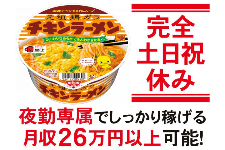職種/仕事内容 | 仕事内容 カップヌードルでお馴染みの日清食品が夜勤アルバイト・パートを大募集! 国道6号線沿いカップヌードル型の煙突が目立つ工場です! 仕事はとっても簡単!未経験でも安心です。 目視検査や検品などのサポート作業が中心!月収26万円以上可能! ▼注目ポイント▼ 〇カンタン作業でガッツリ稼げる 〇月収26万円以上可能 〇土日祝休み 〇完全週休2日制 〇18:00~21:00の短時間勤務もOK 〇パート・アルバイトにも賞与あり※規定あり 〇交通費規定支給 〇車・バイク通勤OK 〇格安の社員食堂完備(半額会社負担) 〇30代、40代、50代の男女活躍中! 〇定年60歳、再雇用あり! 〇中高年も活躍中 〇クリーニング済の制服貸与 〇カップヌードルなど自社商品の割引あり ▼こんな方にぴったり ・未経験だけど夜勤でしっかり稼ぎたい方 ・家事や育児と両立したい方 ・食品工場や軽作業の経験を活かしたい方 同じ環境で働く30代・40代・50代の子育て中女性も多数活躍中! 急な子どもの発熱や体調不良、冠婚葬祭、学校行事など、突発的なお休みにも柔軟に対応OK。 サポート体制は万全です! ▼お仕事内容 インスタントラーメン等の目視検査・検品をお願いします。 カンタンな作業から始められるので、ほとんどの方が未経験スタート! 徐々に業務に慣れていけます。 ・カップやフタの検査や補充作業 ・麺の目視検査や重量チェック ・具材の検査や機械への具材補充 ▼お馴染みの工場で働こう カップヌードル・どん兵衛・チキンラーメンなどの製造工場! 当工場で製造している商品は、皆さんにお馴染みのカップ麺がメインです。 カップヌードル作りに関わるワクワク感を味わえる職場ですよ! 無理なくしっかり稼ぎたい方、お待ちしています! ▼子どもと同じタイミングで休める環境 〇土日祝休みで家族との予定も安心 〇夏季・年末年始の長期休暇あり 〇急な子どもの発熱や学校行事にも柔軟に対応 ▼こんな経験がある方は前職活かせます ・食品製造や食品工場 ・目視検査 ・夜勤・深夜アルバイト ・工場内軽作業 ▼通勤もラクラク 周辺地域(守谷市・つくばみらい市・牛久市・龍ヶ崎市)からの通勤者多数! 無料駐車場完備+ガソリン代支給! ご不明な点等はお気軽にお問い合わせください。 電話でのご応募も可能です! 〇日清食品株式会社 関東工場 TEL/0297-82-6111(パート・アルバイト採用担当まで) ※来場受付・電話問合せ等は平日のみとなります。 |