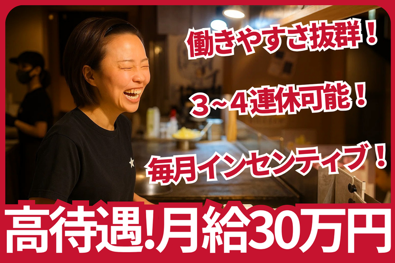 給与 | 月給300,000円~330,000円 給与詳細 基本給:月給 30万円 〜 33万円 固定残業代:なし 【一律手当】 全員に一律で支払われる通勤・皆勤・家族手当金額:なし 全員に一律で支払われるその他手当金額:なし ※スキル・経験によりスタート給与を決定します 【給与例】 給与例 ≪月収例≫ ●入社1年目:キッチンスタッフ ⇒月給30万円+インセンティブ ●入社2年目:副料理長 ⇒月給33万円+インセンティブ ●入社3年目:料理長 ⇒月給37万円+インセンティブ ●入社4年目:統括料理長 ⇒月給41万円+インセンティブ ●入社6年目:マネージャー ⇒月給47万円+インセンティブ 【月次インセンティブ制度】 賞与の代わりに月ごとの成果に応じた インセンティブを支給! (5万円/月※昨年実績) 【個人経費制度】 全社員に個人経費(月5,000円)を支給。 繁盛店視察・本・マッサージなど 自由に使えます |