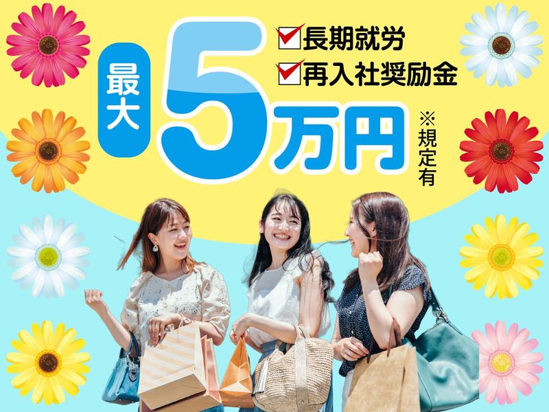 待遇・福利厚生 | 【保険制度】 雇用保険、労災保険、健康保険、厚生年金 【福利厚生】 待遇・福利厚生 【福利厚生】 ◇日払いOK(規定) ◇有給休暇あり ◇事前の職場見学OK ~~~~~~~~~~~~~~~~~~ 充実の奨励金制度で長く安心して働けます! 当社では、長期就労や再入社、紹介採用を対象にした各種奨励金制度をご用意しています! \\奨励金支給キャンペーン実施中// (期間:2025年7月16日~2026年2月28日 までの入社を対象) ――――――――――――――――― 【1】長期就労奨励金キャンペーン 対象:新規入社の方 新規入社から「5ヵ月間」毎月支給♪ ★★★最大5万円GET★★★ ※週30h以上勤務の方が対象(週20~30hの方は最大2万円) ◎始めるなら今がチャンス♪ ――――――――――――――――― 【2】再入社奨励金キャンペーン 対象:退職から6ヵ月以上経過した元スタッフ 再入社で、長期就労奨励金と同等の奨励金を支給! ◎ぜひこの機会にもう一度♪ ――――――――――――――――― 【3】お友達紹介奨励金キャンペーン 対象:紹介した方・された方双方 お友達を紹介して採用された場合「最大6万円(各3万円)」を支給! ※勤務状況や出勤率など、一定条件あり ◎複数名ご紹介いただいた場合は何度でも適用可能♪ ■ 各制度共通の条件 ・その他社内規定あり ・出勤率90%以上が支給の条件(遅刻や欠勤は減点対象) ・給与支給日に在籍していることが必須 ・雇用形態や勤務時間により支給額が異なります 気になる方はぜひお気軽にお問い合わせください! あなたのご応募・ご紹介をお待ちしています。 |