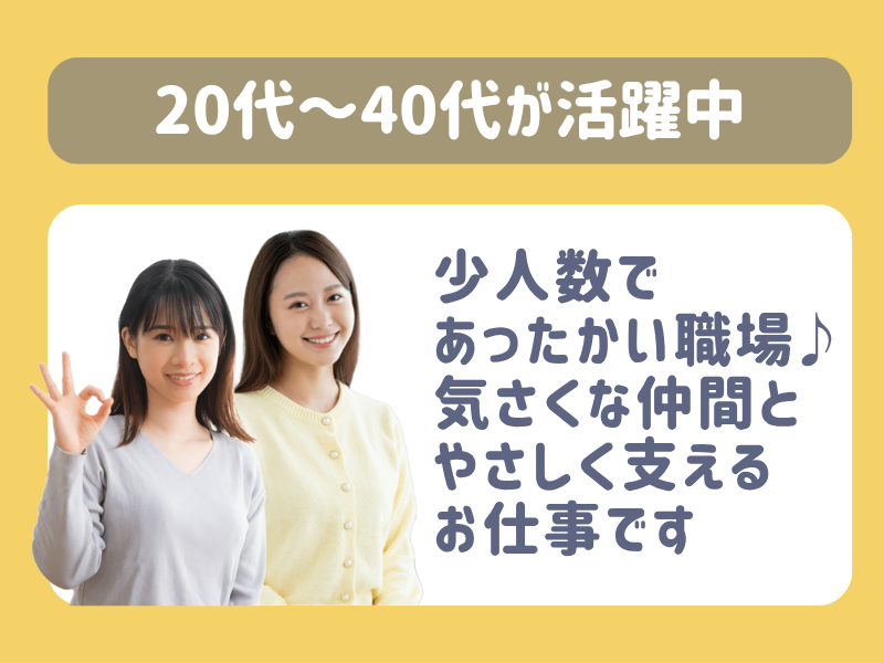職場環境・雰囲気 | 職場環境 【 活躍中のスタッフ 】 ・工場勤務から転職した方 ・子育て中の主婦(夫)さん ・社会と関わる場を求めて働き始めた方 などなど 未経験スタートの方が多数活躍中◎ 20代・30代・40代の 幅広い世代が在籍しています☺ 主婦主夫・学生・フリーター歓迎 |