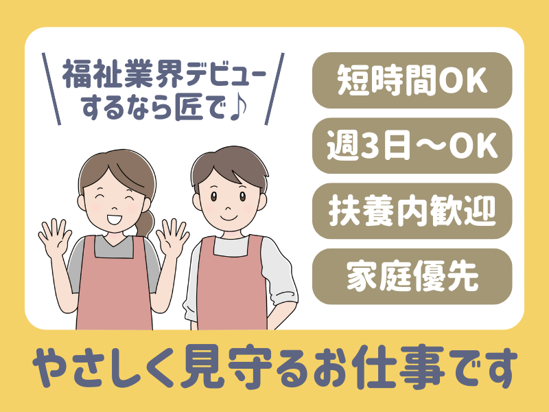 職種/仕事内容 | 仕事内容 ■ 週3日~&1日3h~OK!扶養内OK♪ ■ 家庭やプライベートと両立しやすい ■ 無資格・未経験歓迎☘ ■ アットホームで連携◎な少人数施設 ――――――――――――――――*。・++ 【 お仕事内容 】 就労継続支援B型事業所「匠」での サポート業務です。利用者様の作業を 見守ったり、お手伝いしたり…♪ ◆ 具体的には… ・利用者様の作業状況の見守りやサポート ・トイレシート折りやラベル貼り 袋詰めなどの軽作業 ・利用者様の送迎(普通免許があればOK) ✅ 難しい作業や力仕事はありません◎ ✅ 少人数の施設なので スタッフと利用者様との距離も近く 家族のような温かい雰囲気です☺ 【 勤務地 】 就労継続支援B型事業所 匠(たくみ) 静岡県富士市日乃出町50 マイカー通勤OK♪ ――――――――――――――――*。・++ 【 ここがポイント! 】 (1)無資格・未経験OK! 福祉業界が初めての方も多数活躍中♪ 最初は先輩がしっかりサポート! (2)選べる勤務時間&働き方 家庭やプライベートとの両立が可能✨ 短時間勤務や扶養内OK フルタイムでしっかり働きたい方も歓迎 (3)残業なし&シフト柔軟 平日週3日~OK(土日休み) 学校行事や家庭都合のお休みも 相談しやすい職場です◎ (4)正社員登用あり! 「まずはパートで」から 将来的に正社員を目指す方も大歓迎! 福祉サポートのお仕事を始めませんか? ――――――――――――――――*。・++ まずは見学だけでもOK! 職場の雰囲気を見てから決めたい方も 大歓迎です♪お気軽にご応募ください! 電話番号 ▶ 0545-52-1830 ――――――――――――――――*。・++ |