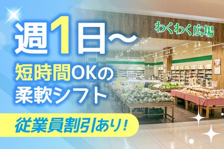 職種/仕事内容 | 仕事内容 仕事内容 新鮮な野菜や果物、 手作り弁当やお菓子などを取扱う 食のセレクトショップ「わくわく広場」で 販売業務全般をお願いします。 <具体的には> ・レジ ・接客 ・品出し ・店内清掃 など 未経験スタートの先輩スタッフ多数! 入社後、イチから丁寧に教えるので 未経験の方でも初めてのアルバイト・パート という方でも安心◎ 「わくわく広場」をご紹介! <いま話題の産直型のスーパー> ◆当日採ったばかりの新鮮野菜 ◆なかなか手に入らない希少フルーツ ◆有名な飲食店のお弁当や手作りパン ◆全国から集めたご当地調味料 などを扱うグルメ特化型店舗! 全国に160店舗に展開しているお店です♪ 柔軟な働き方を応援します! <ご希望のシフトを考慮します!> ☆:時間・曜日・日数など融通バッチリ♪ ☆:「学校」・「かけもち」・「両立」 あなたのライフステージに合う働き方を実現 ☆:もちろんフルタイム勤務も大歓迎です! まずは面接の際にお気軽にご相談ください◎ もちろん勤務開始後の変更もご相談いただけます! 充実待遇が盛りだくさん♪ <従業員割引制度> 全国の”わくわく広場”で使える 従業員割引(10%OFF)あり! <入学祝い金制度(規定)> お子様の小・中・高へご入学時に 2000~3000円の図書カードをプレゼント♪ <独自のライフサポート制度> ご結婚・出産・傷病などに対し、 勤続年数に応じた金一封が支給されます。 |