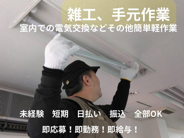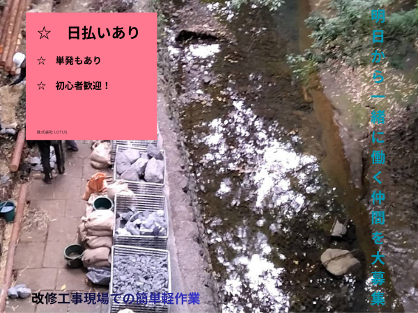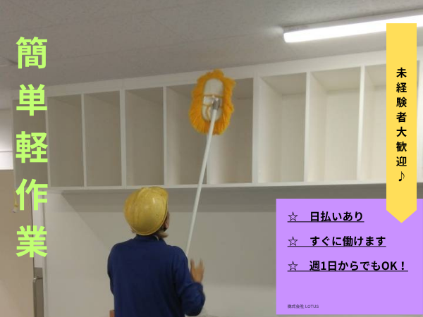 職種/仕事内容 | 仕事内容 休みの日に稼げる短期間の募集もあり! 友達同士でもOK! 学生さんはグループでの大人数でもOK! 超簡単なお仕事なので、まずはお試しで働いてみてください! お試しでも、ちゃんと日払いでもらえますので、ご安心ください(笑) 明日から未経験の方でもすぐに始められる 簡単な軽作業です! 週5日~6日のレギュラー スタッフさんも大歓迎! フリーターや中高年の方も活躍中♪ 片付け、清掃、養生などの 手元、雑工、補助的な簡単な軽作業。 先輩スタッフと一緒に作業ができるので安心。 知識や技術がなくてもすぐにできる 仕事なので、これでお給料頂いていいの? とよく言われます(笑) 【建設関連】 ・清掃 ・水まき ・ハウスクリーニング ・材料準備や道具の手渡し ・傷防止のためのシート類の準備と養生 ・搬入作業での段ボール箱の開梱及び 分別してゴミを出す など 【造園関連】 ・草刈 ・集草 ・植栽植付 ・草木の積み込み など 【清掃工場関連】 ・ローテーションで各清掃工場に回っての 現場の片付け ・メンテナンスの準備や助手補助作業 など ★各種建設関連、造園関連、清掃工場での メンテナンス業務などの現場が 多数あります。 真面目にコツコツと できる方、初心者歓迎! すべての作業に経験や資格は不要です。 |