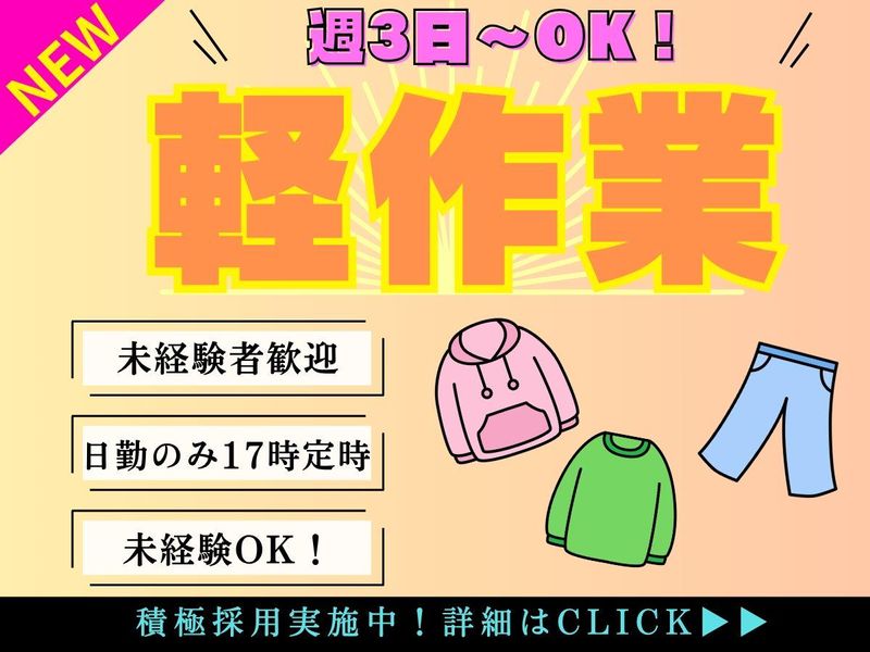 対象となる方 | 求めている人材 ⭐知識・経験・資格は不問(o・з・o) 人柄重視の採用なので、あなたの 「やってみたい」気持ちを応援します! ⭐頑張りは給与に反映! あなたに合った働き方、 はじめませんか(◎>∀<◎) ・・・・・・・・・・・・・・・・・・ ✅未経験者歓迎 ✅無資格歓迎 ✅大学生歓迎/大学生OK ✅主夫・主婦歓迎 ✅フリーター歓迎 ✅経験者歓迎 ✅Wワーク歓迎/副業OK/WワークOK ✅ブランク歓迎/ブランクOK ✅学歴不問(中卒・高卒歓迎) ✅U・Iターン歓迎 ✅年齢不問 ✅経験不問 ✧今回募集するお仕事では、 【物流倉庫バイト】や【倉庫作業】、 【軽作業】などの経験が活かせます! ✧近しい業種の経験として、 【製造】や【倉庫管理】、【工場勤務】、 【配送】や【ピッキング】の他、 【梱包作業】などの経験がある方も大歓迎 男性活躍中です! ✧20代、30代、40代、50代、 シニア・中高年も活躍中! |