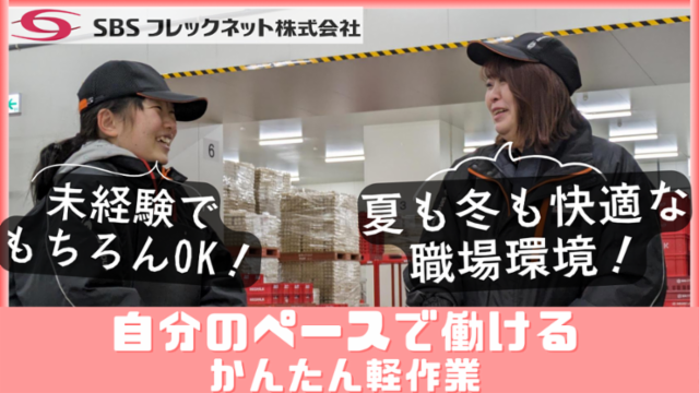 職種/仕事内容 | 仕事情報 ● 仕事内容 大手スーパーマーケットやコンビニ向けの常温食品・冷蔵食品・冷凍商品の入荷・仕分け・出荷のお仕事です。牛乳やヨーグルトなどの洋日配や、豆腐や漬物などの和日配、冷凍商品仕分けなど幅広い商品を取り扱っていただきます。さまざまな商品を扱うので、新しい商品などをいち早く知ることができます。 未経験でも簡単お仕事 バーコードを読み込んで、荷物を種類ごとに仕分けするお仕事のため、間違いにくく初めての方も覚えやすい仕事です。モクモク・コツコツとお仕事したい方におすすめです。未経験者でも安心してお仕事を始められるように、先輩スタッフがやさしくサポートします!すぐにテキパキお仕事できますよ。 シフト相談◎給与前払OK 職場内では役職者も含めて全員が「さん」付けで呼びあい、みんなが遠慮なく意見を言い合える環境づくりを心がけています。出勤日数や曜日の固定なども柔軟に対応いたします。お気軽にご相談ください。また、給与の前払いOK!スマホで簡単、上長承認や理由記載も不要です。振込手数料は全額会社負担なのでご安心ください。 交通費支給あり マイカー・バイク通勤の方には、マイカー通勤費を支給いたします。また、駐車場も無料で使用できますのでご安心ください。そのほかの交通手段でご出勤される方にも、必要に応じて交通費を支給します。通勤距離や、ライフスタイルに合わせてお好きな通勤方法を選べるのも魅力です。 SBSフレックネットとは SBSフレックネットは長年「食の物流」に特化してきた会社です。社内では役職者も含めて全員「さん」付で呼び合い、誰もが意見できる環境です。実際、新入社員の提案が採用されたこともあります。進化をやめない会社だから、業界トップクラスで居続ける。SBSフレックネットは、未来の物流サービスを築きます。 |