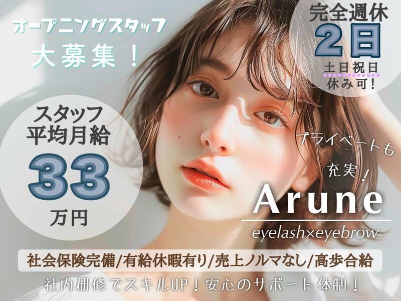 職種/仕事内容 | 仕事内容 ★2025年9月に新規オープンするサロン「Arune」での募集です! オープニングスタッフとして、一緒にお店を作っていきませんか? ▼ポイント ✅半年間は条件付きで月30万円の最低保証あり ✅歩合最大10%+指名料80%バックで安定+高収入を両立 ✅社保完備・産休育休制度・有給前借りなど福利厚生も充実 ✅外部講師による研修でスキルアップも可能 ✅無理なく続けられる働きやすさ(予約がなければ18:30退社OK!) ▼当社について 当サロンは、技術と接客の両立を大切にした地域密着型のまつげサロンです。 外部講師による定期研修や丁寧なカウンセリングを通じて、お客様一人ひとりに寄り添った施術を提供しています。 スタッフ同士の関係性も良好で、長く安心して働ける環境づくりを大切にしています。成長したい方にも、安定して働きたい方にも最適な職場です。 ▼仕事内容 アイブロウやまつ毛パーマのトレンド施術を中心に、お客様一人ひとりに丁寧に向き合える環境です。 以下の業務を担当していただきます。 ●まつ毛パーマ/まつ毛エクステ/アイブロウ施術 ●店内清掃、備品補充など、店舗運営業務の一部 ●スキルに応じて技術研修・後輩育成も担当可能 など ▼入社後の流れ 入社後は技術チェックからスタート。 安心してお客様対応ができるよう丁寧にフォローします。 希望者には責任者・独立支援もあり! |