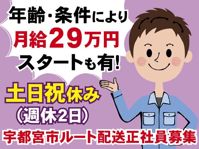職種/仕事内容 | 仕事内容 ・未経験でも月給23.7万円~スタート! 年齢・条件等によって 29万円スタートの可能性もあり!! 月給23.7万円~30.6万円(年齢・条件等による) ・職務経験なくても大丈夫!サポート体制充実 ・安定の日勤業務 ・週休2日でプライベートも充実 ・昇給年1回、賞与年2回あり! ・各種社会保険完備 ・20代、30代、40代、50代の男性が活躍中 ・マイカー通勤可能 ・入社日応相談 宇都宮市でルート配送スタッフ 正社員として働きませんか? 現在、幅広い年代の男性が活躍中です。 特別な資格・経験は不要です。 配送業務経験のある方も、 未経験の方も共に活躍できるお仕事です。 しっかりしたサポート体制がありますので 安心して従事できます! 【仕事の詳細】 既存のお客様への玄関マット・モップ、 ミネラルウォーター等の配送、交換業務 ※1日30件程度、 件数はエリアや配送距離等により異なります。 配送メインのお仕事です。 ※一部、営業業務あり(全体の1~2割程度) 配送・営業どちらも未経験OK! 〈1日の流れ ※一例〉 8:30/朝礼、業務開始 9:00/その日の配送商品を準備し、 ハイエース等のワンボックスカーにて お客様のところへ順番に伺います 12:00/昼休憩 13:00/午後の業務開始 18:00/帰社、翌日の準備をして 終わり次第帰宅します。 (19:00~20:00くらいに帰宅する社員が多いです) 外回りの仕事で、仕事量も決まっているため 慣れれば自分のペースで仕事を進めることができます。 【勤務地】 株式会社アスワン 宇都宮営業所 宇都宮市砂田町345 【ここがポイント】 ・月給23.7万円~30.6万円以上可能(年齢等による) 安定して稼げます。 ・働きやすい日勤業務 ・土日祝休みでプライベートとの両立もはかれます。 ・配送、配達、ルート配送業務、ドライバー、 営業などをしたことがある方は経験が活かせます! 未経験でも運転免許があれば問題なし! しっかりサポートいたします。 ・マイカー通勤可能。もちろん交通費規定支給。 ・昇給年1回、賞与年2回あり。 あなたの日々の頑張りに応えます! ・現在、20代、30代、40代、50代の男性が活躍中 【こんな方にオススメ】 ・未経験でも新しい事にチャレンジしたい方 ・配送、配達、ルート配送業務、ドライバー、 営業などの経験がある方 ・自身の経験、スキルを活かした仕事がしたい方 ・安定した収入を希望の方 ・基本土日お休みの仕事をお探しの方 ・歩合制などに関して日々の努力、向上心が旺盛な方 株式会社アスワンは栃木県内を中心に 玄関マット・モップ・サニタリー商品・ 厨房用グリスフィルター等のレンタル、 サーバー型ミネラルウォーターの製造・宅配、 ビル総合管理業等を通して、 皆さまの快適な環境づくりをサポートいたします。 仕事内容や応募に関してご不明な点は お気軽にお問い合わせください。 TEL 0282-20-6810 |
