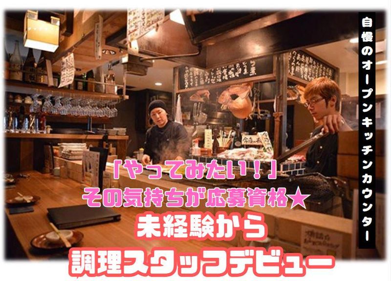 対象となる方 | 求めている人材 ★未経験大歓迎 ★料理経験・調理師免許取得者優遇 ★業界未経験歓迎 ★学歴不問 ★ブランクOK ★経験不問 ★中途入社50%以上 ★第二新卒歓迎 ★ノルマなし <こんな方大歓迎> ・料理が好き ・おもてなしの心を大切にできる方 ・スキルを身に付けたい ・繁盛店で働いてみたい ・接客も好き ・お酒が好き ・包丁さばきを身に付けたい もちろんアナタの“人柄”も重視★ |