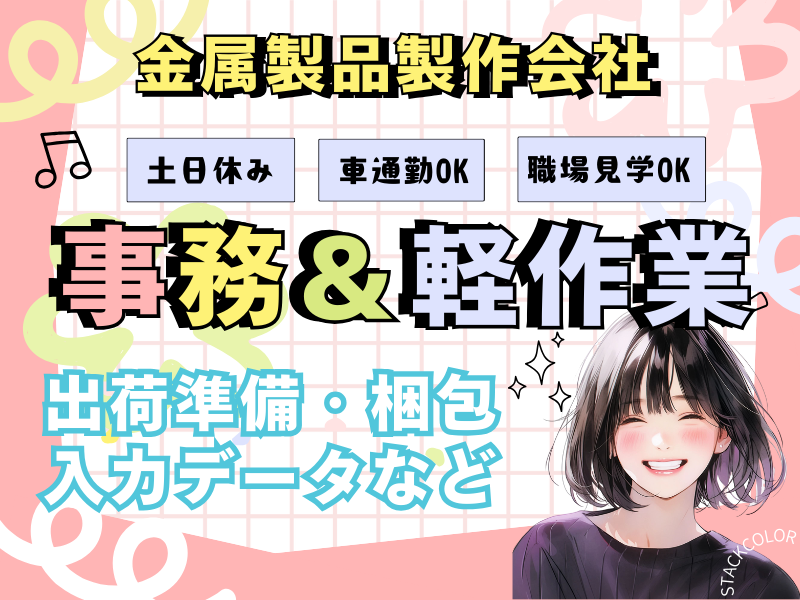 職種/仕事内容 | 仕事内容 お急ぎの方はこちらにお電話ください! ▶090-3421-9375(担当携帯)※応募者専用ダイヤル SMSでの問い合わせもOKです◎ オーダーメイドの金属製品を製作している企業にて、 事務と軽作業を担当していただけるスタッフを募集しています! 【主な業務内容】 ✅Excelフォーマットへの数字入力データの正確な入力を行います。 ✅ウェブサイトからの送り先名・住所入力と送付状作成専用のウェブサイトを使用して、お客様の情報を入力し、送付状を作成。 ✅出荷準備・梱包製品の出荷に向けた準備と梱包作業 ✅電話応対お客様からの問い合わせ対応や、社内の連絡。 ✅製品のバリ取りなどの製造作業製品の仕上げ作業として、バリ取り等。 |