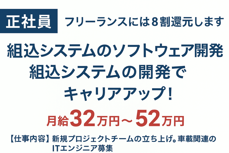 職種/仕事内容 | 仕事内容 ・車載システムを中心としたプロジェクトメンバー ・組込ソフトウェアの 設計・開発・テスト・運用 ・経験に応じて リーダー候補・SE・PG いずれも歓迎 ※リーダーやマネージャーへのキャリアパスあり ※案件によりリモートワーク可能 |