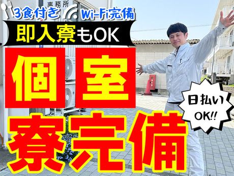 待遇・福利厚生 | 【保険制度】 雇用保険、労災保険、健康保険、厚生年金 【福利厚生】 待遇・福利厚生 【福利厚生】 ・入社祝い金3万円支給(規定あり) ・寮完備(エアコン・TV・冷蔵庫・布団付Wi-Fi完備・3食付)※規定あり ・資格取得支援制度(玉掛・重機関係等の資格も会社負担で取得可) ・昇給随時 ・社会保険完備 ・車通勤、バイク通勤OK(入寮時、持ち込み可!) ・正社員登用有 ・作業着・道具貸与 ・各種手当有 ・日払いOK、週払OK(規定有) ・防寒具支給 ====== 入寮者【1日の流れ(モデルケース)】 (1)寮で起床、朝食(温かい食事あり) (2)出勤、荷物を積んで現場へ (3)現場で朝礼 (4)作業開始(未経験者は先輩の補助作業からスタート) (5)昼食(お弁当支給) (6)午後の作業 (7)作業終了、片付け (8)帰宅、大浴場でリフレッシュ (9)夕食、プライベートタイム |