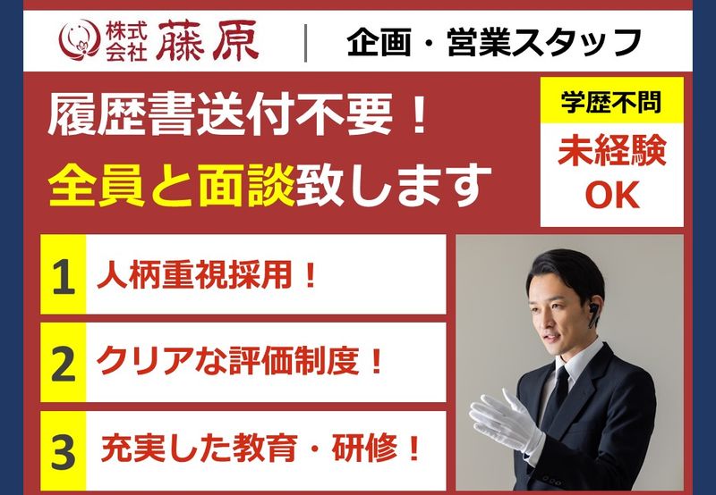 その他 | 概要 営業企画スタッフ 募集職種 営業(個人) 雇用形態 正社員 勤務先店舗・オフィス 株式会社藤原 募集内容 この求人のポイント 【未経験OK!賞与年2回/リフレッシュ休暇あり■ふれあい営業 企画スタッフ】ブランクOK/車通勤OKまずは会社見学・お話だけでもOK!お気軽にご応募ください♪ <株式会社藤原とは?> 弊社の求人をご覧いただきありがとうございます。 株式会社藤原は静岡県富士宮市に拠点を置き40年以上にわたって 地域の皆様をサポートさせていただいている葬儀社です。 他にも仏壇仏具の販売事業も行っており、現在は51名のスタッフが活躍してくれています。 更なる出店・事業拡大のために「新たな仲間」を募集する運びとなりましたので お仕事内容・募集要項などをご覧いただきご応募いただけますと幸いです。 <業界未経験でも活躍できる働きやすい環境です!> 現在活躍中のスタッフの前職: ・冠婚葬祭(30%) ・金融(20%) ・医療・介護・福祉(10%) ・教育(10%) ・店舗販売スタッフ・アパレル(10%) ・エンターテインメント(10%) ・販売職(10%) 上記のように前職経験は様々ですので、お気軽にご応募ください! 勤務地: 静岡県富士宮市中央町1-8(本店) アクセス: JR 身延線/富士宮駅 ※基本的に本店へ出社いただきますが、 イベントやそのほかの取り組みに応じてその他のホールへ出勤いただく場合もございます 業種・業界 専門サービス 必須スキル・経験・資格 <経験> ・業界経験不問 ・異業種からの転職・未経験歓迎 <能力・資格・スキル> ・要普通免許(AT 限定可) 採用担当者の連絡先 manage@loveyou-toubu.co.jp 受動喫煙防止措置条項 受動喫煙対策 :敷地内禁煙(詳細は面接時にお尋ねください) |