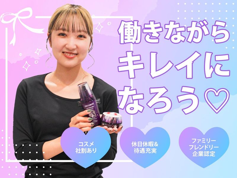職種/仕事内容 | 仕事内容 アマノ各店舗にて、お客様に合わせた化粧品・医薬品・サプリメントをご提案。 「よりキレイになりたい」「より元気でいたい」をサポートするお仕事です! ♡『amano』ってどんなお店? 愛知県内にのみ展開している化粧品と医薬品の専門店です♪ ハイブランドのコスメや美容液、サプリメントなどを取りそろえ、お客さま一人ひとりに合ったアイテムをご提案しています。 接遇を大切にしており、ただ「売る」だけではなく、お客さまとの会話を楽しみながら、キレイや元気を一緒に叶えていくスタイルです♪ ♡キャリアアップも目指せます! 将来的には「デュアルナビゲーター」として、美容だけでなく健康面からもトータルにサポートできる存在へ。※社内認定資格制度です コスメや美容液に加えて、サプリや医薬品も組み合わせたご提案ができるようになります。 もちろん、がんばった分は資格手当などでしっかり評価します! <具体的なお仕事> 店舗に来店されたお客さまへ、こんなご提案をお願いします♪ 季節やトレンドに合わせたメイクアドバイス、お肌の状態や変化に合わせたケア方法のご提案 などを行っていただきます。 【一日のスケジュール例】 09:30 出勤&清掃・開店準備 10:00 開店&接客スタート 13:00 休憩 17:00 仕事帰りのお客様が多いピークの時間 18:30 退勤!お疲れ様でした! ※すべて店舗内での対応なので、外回りはありません! <働くポイント> ♡ 通いやすさバツグン! 名古屋市の中心部にある店舗が多く、どのお店も駅チカ(徒歩5分以内)。通勤もラクラクです♪ ♥ 20代~30代を中心に活躍中! 男女比は1:4と女性スタッフが多数♪ 各店舗3~5名のビューティアドバイザースタッフが在籍しており、抜群のチームワークのもとで業務を進めています! ♡ ライフイベントにもしっかり対応! 残業はほとんどナシ。さらに、産休・育休の取得&復帰率はなんと100%! 男性の育休実績もあり、子どもが小学校を卒業するまで1日6時間の時短勤務も可能です。 結婚や出産など、ライフスタイルが変わっても安心して長く働けます◎ ♥ 当社は「仕事もプライベートも大切にできる」ファミリーフレンドリー企業として認定されています! |