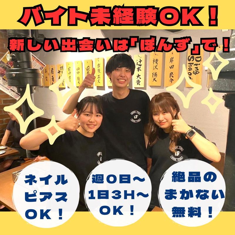 職種/仕事内容 | 仕事内容 【2024年6月末にオープンしたばかりの新店!】 【具体的な業務】 〇ホール〇 注文取り、料理、ドリンクの提供。 お客様卓で、お肉を焼いて提供します。 お客様との会話も増え、対人力爆上がり! 〇キッチン〇 簡単な盛り付けからスタート。 慣れてきたら下ごしらえや簡単な料理もお任せしていきます! スタートはどっちからでもOK! 【お店について】 コンセプトは「知り合いがやっている焼肉屋」。 お客様がふらっと立ち寄れるでも日々のちょっとした贅沢ができるお店を目指しています。 お客様の名前を覚えたり、会話をしながらお肉を焼いたりなどより近い距離で行う接客。 将来就活や社会人になっても役立つ接客・対人スキルが身につきます! 【店長の想い】 バイトでお金を稼ぎたい、というのは大前提あると思います。 でもせっかくバイトをするなら、今後の人生において、1つでも2つでもプラスになればと思っています。 ビジネスマナー、営業力 、トーク力を身に付ける。 一生モノの仲間をつくる。次の仕事に活かせる知識をつける。なんでもOK! ぼんずで働くからこそ得られる価値をたくさん提供していきます! 【ぼんずならではの魅力がたくさん!】 無料の絶品賄い!ワイワイ楽しいバイト仲間!オシャレも楽しめる! 「美味しい賄いが食べたい!」「家の近くで働きたい!」 「会話スキルをつけたい!」などなど… 応募理由はなんでもOKです。気軽にご連絡くださいね♪ |