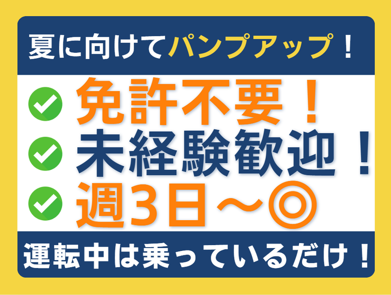 対象となる方 | 求めている人材 【経験スキル不問】 \ 免許不要!未経験者歓迎 / ・フリーター歓迎 ・男性スタッフ活躍中 ・経験者優遇 ・ミドル応援 ・Wワーク・副業OK 【こんな方にオススメ】 ・ドライバーとして、ゆくゆくは働きたいから、働き方を助手として見てみたい! ・働き方を変えたい! ・今より給料アップしたい!そんな方に。 もちろん、ブランクのある方や異業種からのチャレンジも可能ですよ! |