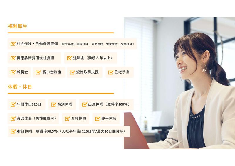 休日休暇 | 休日休暇 ・完全週休2日制 ・年間休日120日以上 ・残業15~20H前後 ・夏季休暇 ・年末年始休暇 ・GW休暇 ・年間休日120日以上 |