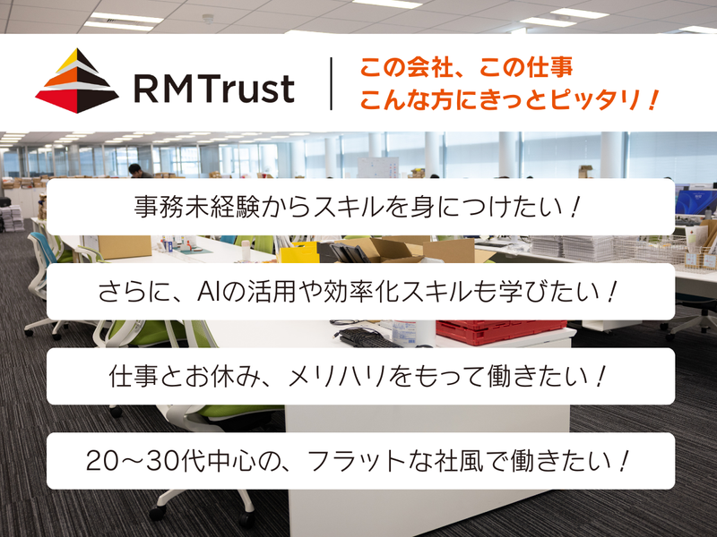 職種/仕事内容 | 仕事内容 【コツコツタイプ、モクモクタイプ大歓迎!】新規事業で事務職デビューを応援します★ - このお仕事のCHECK POINT! - ✅事務未経験デビューから活躍中の先輩多数! ✅20~30代が中心で、フラットな社風! ✅AI活用や業務効率化も学べる! ✅駅チカのきれいなオフィスで快適勤務! ✅メリハリつけて働きたい方にピッタリ! 業務拡大のため、新プロジェクトの一般事務スタッフを大募集します。 新プロジェクトは正社員、アルバイト合計で70名体制となる予定! 皆さんには専用の入力画面やExcelに情報の入力をお願いします。 PCや事務のスキルに合わせた業務があるので、徐々にレベルアップが可能 事務未経験・ブランクがある方も先輩社員がフォローするので安心して働けます。 面接時には社内見学も実施しておりますので、実際の就業環境を確認いただくことが出来ます。 - 具体的な仕事内容や職場環境 - 1人1人のスキルに合わせて以下のお仕事を用意しております。 1)データ入力業務 不動産賃貸物件の契約に関するデータ入力を行います。 入力する項目は決まっているので、タイピングができる方であればすぐにご対応いただけます! マニュアルも用意しておりますので、安心してご対応いただけます。 不動産に関する知識は不要です。お仕事をしながらスキルアップも目指せますよ♪ 2)サポート業務 郵便の仕分けや書類開封、ファイリングなどを行います。 仕分けのポイントやファイリングの方法などは丁寧にお教えします! 3)その他付随業務 書類のスキャン、シュレッダー、専用端末を使った伝票登録など庶務業務を行います。 チーム内で連携を取りながらお仕事を割り振りさせていただきます。 ★電話対応・顧客対応はほとんどナシ!★ 電話での業務、お客様対応等はほとんどございませんので、 電話は苦手だけど事務の仕事に挑戦してみたい!という方、是非ご応募ください。 <きれいで広々としたオフィス> 駅徒歩1分のとってもキレイなオフィスでお仕事ができます! 休憩室も完備しておりますので、オンオフをしっかり分けてお仕事することが出来ますよ。 面接時に会社見学を実施しております。お楽しみに♪ <落ち着いた環境> 社員は落ち着いた雰囲気の方が多く、静かに仕事をすることが出来ます。 もちろん、席が近い方や同期とは仲良くなる機会は沢山ございますが、 落ち着いた環境でお仕事がしたい方にはピッタリの職場です。 まだまた発展途上のチームですので、席の配置や業務の進め方などどんどん意見をいただけると嬉しいです! オフィスづくり、チームづくりに興味のある方、是非ご応募ください! - 先輩社員に聞きました! - ■Kさん(元工場勤務・入社4年目) ほとんどPC経験がない中で入社しましたが、先輩たちに支えられてスキルを学び、今は楽しく仕事しています。新しいチームの立ち上げは苦労も多いですがとても面白く、学びも多いです。一緒に頑張っていきましょう! ■Sさん(元事務職・入社1年目) 同じ事務でも不動産の知識が学べそうなこと、またAIやRPAの活用など業務効率化に積極的と聞き、勉強したくて転職しました。先日結婚した時は祝い金5万円と引越費用補助をいただき、とても嬉しかったです。 ■Mさん(新卒入社1年目) 社員は本当にいい人ばかりで、最初は不安でしたが今は毎日会社に来るのが楽しみなくらいです。仕事に集中して休憩はしっかり休む。有休は半日単位でとれるしムダな残業もなく、メリハリをもって働いています。 ■Sさん(元不動産仕入・入社4年目) 前職の不動産知識を活かして事務の仕事がしたいと、アールエムトラストに転職しました。フラットな社風が魅力で年齢や役職、社歴に関係なく意見を言うことができ、若いうちから成長できる環境だと思います。 |