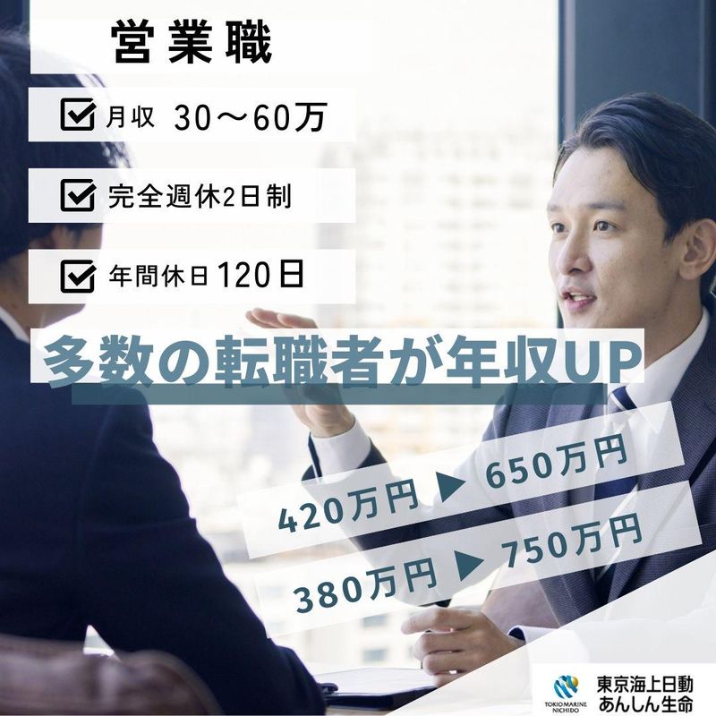 職種/仕事内容 | 仕事内容 \\ 当社で働くメリット // 最初の3日間は、 本社で基礎を学ぶ導入研修を実施! その後の1ヶ月は配属先での支社研修にて、 商品知識やアプローチ方法を身に付けていきます。 そうして基本をじっくり習得したら ついに現場デビュー! 都度先輩社員がサポートします◎ 時間をかけて成長できるため、 業界未経験の方もご安心ください! ☆月・木にある社内会議には勉強会もあり ☆FP等の資格取得支援も整備 【1日の流れ (例)】 09:00/朝礼開始 09:15/営業所長・スタッフへの事前相談など 10:00/担当お客様への訪問 16:30/活動報告入力、明日の準備、 営業所長や主任への報告など 17:00/終業 |