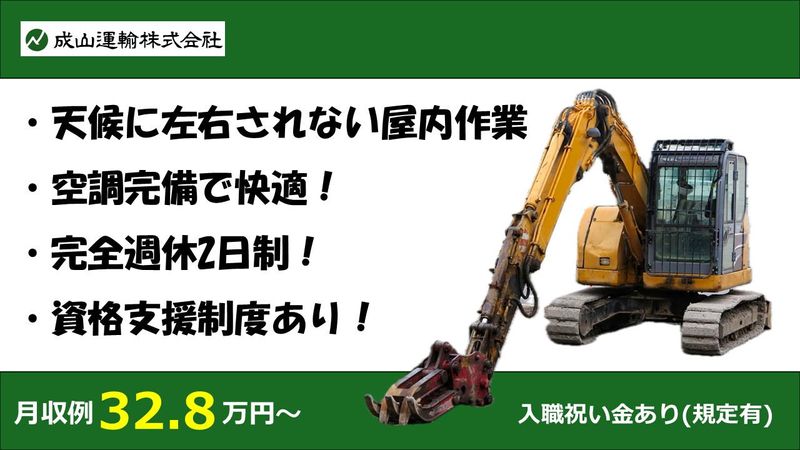 職種/仕事内容 | 仕事内容 ┏・・・・・・・・・・・・・┓ 重機は空調完備の快適な環境 夏でも空調服は不要! ┗・・・・・・・・・・・・・┛ 「暑さや寒さに左右されず、 安定した環境で働きたい」 「資格を活かして、しっかり稼ぎたい」 「長期で腰を据えて働きたい」 そんな方にぴったりの職場です! 当社は、産業廃棄物処理場にて 建設廃材や混合廃棄物の選別・ 積み込み作業を行っております◎ ✧・━・✧・━・✧・━・✧・━・✧・━・✧・━・✧ 重機(ホイールローダー・バックホー)を 使用した作業が中心で、基本的には重機に 乗りっぱなしの業務となります。 空調完備の快適な重機内での作業なので、 夏場でも空調服は不要◎ 天候に左右されることもなく、安定した環境で働けます! また、産業廃棄物といっても生ゴミなどの 臭いの強い廃棄物は扱っていませんので、 衛生面でも安心です。職場にはシャワーや 洗濯機も完備しており、 仕事終わりも快適に過ごせます! ✧・━・✧・━・✧・━・✧・━・✧・━・✧・━・✧ ~~~嬉しいポイント~~~ ・重機は空調完備で、夏でも涼しく快適! ・天候に左右されない屋内作業だから、雨の日も安心 ・入社祝い金5万円支給(規定あり) ・完全週休2日制でプライベートも充実 ・資格取得支援制度あり(会社負担) 安定的に勤務できる当社への ご応募お待ちしております! - 【勤務地】 大阪府堺市西区築港新町4丁2番3号 *南海「石津川」駅~車で約10分 *車・バイク通勤OK ※こちらの派遣先へ常駐で勤務をしていただきます |
