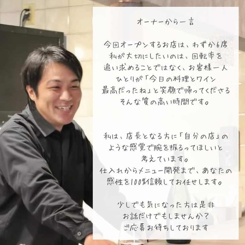 職種/仕事内容 | 仕事内容 【新規OPEN】 「もっと料理を楽しみたかった。もっと自分の時間も欲しかった。」 そんな想いを持つ料理人の方へ。 長崎駅エリアに新しくオープンする、和食と国産ワインの隠れ家和バル。 カウンターわずか6席。バタバタと忙しさに追われるのではなく、 お客様一人ひとりと会話を楽しみながら、一皿に集中できる環境を整えました。 【店長として、あなたの「こだわり」を一任します】 オーナーからの細かな指示はありません。 仕入れからメニュー開発まで、店舗運営の全般をあなたの裁量でお任せします。 「今日は良い地魚が入ったから、あえてワインに合うこの味付けで」 といった、料理人としての直感や遊び心を大切にできる環境です。 <具体的には> 旬の食材、地魚を活かした創作和食の調理 国産ワインとのペアリング考案・メニュー作り 仕入れ、在庫管理、SNSでの発信 6席のお客様への接客・サービス <ターゲット層> 40代のキャリア女性を中心とした、落ち着いてお酒と食事を楽しみたい大人のお客様がメインです。 騒がしい居酒屋ではなく、質の高い時間とサービスを提供することを目指しています。 【アピールポイント】 飲食店では珍しい「日祝休み」: 友人や家族と予定を合わせやすく、プライベートを犠牲にしません。 15時出社で午前中を自由に: 満員電車とは無縁。役所や銀行の用事も、趣味の時間も、たっぷり確保できます。 残業ほぼなし、22時閉店: 終電を気にすることなく、仕事終わりの時間も大切にできます。 圧倒的な裁量権: 「自分の店」のような感覚で、得意な料理やアイデアをどんどん形にしてください。 店長候補の募集ですが… いきなり1人で任せることはありません しっかりと研修を行い、段階的にお店をお任せしていきます。 「いきなり店長は不安…」という方でも大丈夫です。 安心してご応募ください。 ※基本は1人営業ですが、6席のため無理のない オペレーションです 仕込み・営業ともに余裕を持って回せる設計にしています 忙しさに追われるというより 「お客様としっかり向き合える仕事」です。 営業に慣れてきてから段階的にステップアップしていきましょう。 コンセプトは居酒屋よりちょっと贅沢な和バル「和食×国産ワイン」 賑やかな駅前から少し離れた場所に佇む、 カウンターわずか6席の小さな和バル。 こだわりの国産ワイン、そしてそれらに寄り添う 和食を提供する「大人の隠れ家」です。 ■ここがポイント! 「自分の店」のような感覚で: 6席という距離感だからこそ、お客様の反応が ダイレクトに伝わります。 和食×お酒のペアリング: 国産ワインの知識を活かしたい、学びたい方に最適。 裁量の大きさ: 仕入れやメニュー開発など、 現場の運営を幅広くお任せします。 失敗を恐れずドンドン挑戦して下さい。 【仕事内容】 店長候補としてお店を任せていきます ・仕込み ・調理 ・メニュー考案 ・店舗運営 ・接客 新店なのでメニューの提案も歓迎します。 お店の顔としてやりがいのある環境です。 「1日の流れ」 例: 15:00 出勤 15:00~16:00(仕込み) 16:00~17:00(休憩1H) 17:00~22:00(営業) (ラストオーダー21:30) 22:00~閉店作業(終わり次第退社) (6席なので一人ひとりのお客様と会話しながら調理・提供) ※事務作業は最小限で、料理に集中できる環境です。 ※ 旬の地魚を使ったお造りや、国産ワインに合う創作料理など、あなたの得意料理をメニューに反映できます。 ※基本ワンオペ業務です この仕事のリアルな魅力 ・大箱のようにバタバタ走り回ることはありません ・お客様と会話しながら落ち着いて働けます ・自分の料理やお酒の提案がそのまま売上に直結します ・「自分の店みたいに働きたい人」には最高の環境です 【オーナーからの一言】 「料理を作るのは好きだけど、今の環境では忙しすぎて一皿に集中できない」 「自分のアイデアを形にしたいけれど、マニュアルに縛られている」 もしあなたがそんな風に感じているなら、ぜひ一度お話ししませんか。 今回オープンするお店は、わずか6席。 私が大切にしたいのは、回転率を追い求めることではなく、お客様一人ひとりが 「今日の料理とワイン、最高だったね」と笑顔で 帰ってくださる、そんな質の高い時間です。 私は、店長となる方に「自分の店」のような感覚で腕を振るってほしいと考えています。 仕入れからメニュー開発まで、あなたの感性を 100%信頼してお任せします。 もちろん、最初は支店の日本酒バーで一緒に研修を行い、段階的に慣れていただくので安心してください。 私自身、仕事への向き合い方は良い仕事をするには「心身のゆとり」が不可欠だと思っています。 だからこそ、飲食店では珍しい「日曜・祝日休み」や「22時閉店」を導入しました。 長崎駅エリアで、一緒に新しい大人の隠れ家を 作っていける。 そんな情熱を持った方との出会いを、心から楽しみにしています。 |