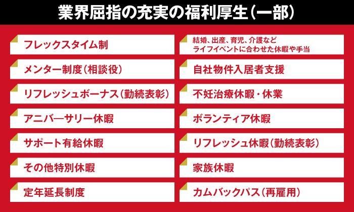 待遇・福利厚生 | 【保険制度】 雇用保険、労災保険、健康保険、厚生年金 【福利厚生】 待遇・福利厚生 【福利厚生】 ・賞与年2回(個人実績による) ・交通費支給(社内規定による) ・社用車貸与 ・退職金制度(勤続3年以上) ・財形貯蓄制度 ・社員持ち株会制度 ・資格取得補助制度 ・資格手当 ★宅建保有者には35万円支給(入社時5万円+初回賞与時15万円+2回目賞与時15万円) ★入社後に宅建を取得いただいた場合、20万円のお祝い金支給(2025年試験合格者が対象) ・社内表彰制度 ・自社物件入居制度(引越し祝い金10万円/毎月1万円/家族帯同者3年間、独身者2年間) ・契約保養所 ・定年延長制度あり(定年は60歳) ★その他ライフイベントに合わせた各種補助・祝い金制度あり <U・Iターンサポートあり!> U・Iターン転職に伴い発生する費用を、大東建託がサポートします。 ★自社物件入居者支援制度 仲介手数料免除・引越し祝い金10万円支給・毎月1万円家賃補助:独身者2年間、家族帯同者3年間 ※気になる方は、面接の際に詳細を聞いていただければと思います。 ※支給は入社後となります。 |