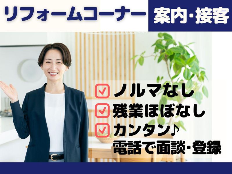 職種/仕事内容 | 仕事内容 ★:・.――――――――――――.・:☆ ✨ エディオン八木店内での接客 ✨ ✨ 呼び込みなし!電話対応なし! ✨ ✨リフォーム業界経験があればOK ✨ ✨選べる通勤→車・バイク・自転車✨ ★:・.――――――――――――.・:☆ \業界経験が活かせる!/ 家電量販店の“リフォームコーナー”で キッチンやトイレ、お風呂などを中心とした お客様の「見学をお手伝い」するお仕事♪ -✄ 《お仕事内容》 ✅カタログやマニュアルを見ながら 展示コーナーをご案内 →「このキッチン素敵ですね~」など、 見に来られた方とお話ししながらご案内! ✅お客様の要望に応じてご自宅訪問の調整 →訪問スタッフの予定をチェックして、 お客様と「いつにするか」を一緒に確認♪ ✅社内の人に内容を伝えておしまい◎ →話した内容を、社内チャットや システムに入力するだけ! ⚓落ち着いた空間でゆったり接客 平日は比較的落ち着いているので カタログやマニュアルを眺めながら 商品の確認&最新知識を吸収できます! ⚓難しい接客や電話・ノルマはありません ⚓社員さんが近くにいるので 不明点があればすぐ相談できる環境です! -✄ 《ここもPOINT!》 ⭐朝はゆっくり10時スタート ⭐大手優良企業=長期で安定して働ける ⭐通勤手段イロイロ!駐車場なども完備 ⭐希望休提出可能!土日祝でもお休み可 |