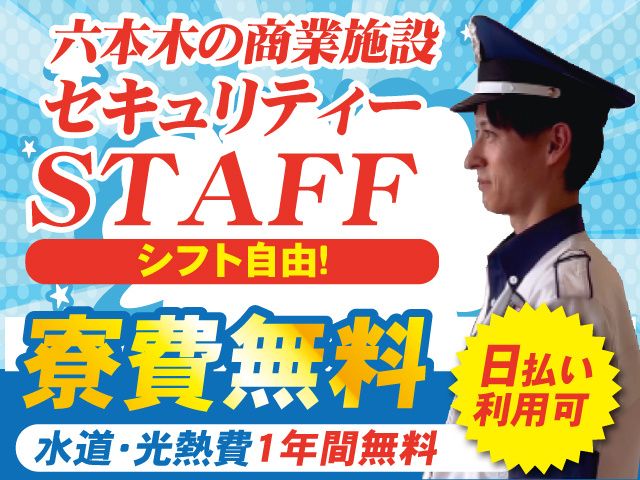 その他 | 職種補足 【施設警備員】商業施設での常駐施設警備 職種 施設警備 雇用形態 契約社員 社会保険 健康保険あり,厚生年金あり,雇用保険あり,労災保険あり 試用期間 あり 6ヶ月 日給8,582円 待遇の変動なし 喫煙環境 敷地内禁煙 受付先名 共栄セキュリティーサービス株式会社 東京支社 〒102-0074 東京都千代田区九段南1丁目6番17号 千代田会館 TEL:0120-200-301 |