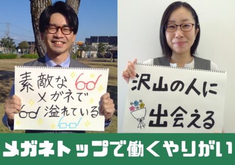 職種/仕事内容 | 仕事内容 ◇◇◇◇◇ お仕事内容 ◇◇◇◇◇ お客様への接客を中心とした業務をお任せいたします。 具体的には… お客様への商品説明や提案、メガネの受け渡しなどの接客 購入までのサポート、また入社後の知識・技術の取得に応じ 視力測定、レンズ加工・調整、商品の発注や在庫管理など。 様々な業務を経験出来るで将来のキャリアにも役立ちます! ============ メガネトップはこんな会社です ============ 【眼鏡市場】を展開。 製販一体化や超ドミナント戦略、品質と価格の両立など 眼鏡業界の旧習に捉われない挑戦を続けてきた結果、 全国47都道府県に1000店舗以上を出店しています。 売上946億2000万円と、 業界トップクラスの実績を誇っている眼鏡市場です。 ============= 自分に合った働き方が出来る ============= 様々なメンバーが働く弊社、 ・短時間(土日祝含む週3日~5日、1日6h~OK)で勤務したい方 ・子育てが一段落した主婦(夫)の方 ・眼鏡業界は未経験だけど接客・販売が好きな方 今の生活や、将来のなりたい姿に合わせて働けます! =============== 長く働ける環境・研修制度も充実 =============== スタッフは20代~30代が58%を占めており、 男女比はほぼ5:5で、男女問わず活躍中。 スタッフのほとんどが未経験からのスタート! 新商品の勉強会等は定期的に開催。 お客様の肌や髪の色にあったメガネをアドバイスできる 「パーソナルカラー研修」や「階層別研修」 等もあり、常にスキルアップできる環境。 長く働ける環境 スタッフの年代は20代~30代が58%を占めており、 男女比はほぼ5:5で、男女問わず活躍中です。 スタッフのほとんどが未経験からのスタート! |