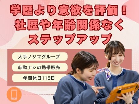 職種/仕事内容 | 仕事内容 人柄とやる気が武器になる職場。 学歴に自信がなくて就職活動に不安を感じていませんか? 「大卒じゃないと良い仕事に就けないのでは」「経験が少なくて評価されないのでは」 そんなコンプレックスを抱えがちな方も多いと思います。 でも当社なら大丈夫。 大切なのは“学歴”ではなく“人柄”と“意欲”。 未経験からでも丁寧な研修で知識やスキルを身につけられるので、 高卒の方でも安心してキャリアをスタートできます。 - 【お仕事内容】 やりがい抜群! auショップでの料金相談や故障受付、 ご契約プランの改善提案をメインにお願いします。 親身になって対応することでお客様に喜んでいただけるやりがいのあるお仕事です。 その他、スマホやWi-Fiなどの サービスの提案や販売も合わせてお任せしていきます。 【休日数変更しました!】 年間休日115日へ変更! 有休もしっかりと使えますのでライフワークバランスも〇 - 【安定のノジマグループ】 au・UQモバイルショップを運営する当社は、2017年に設立した 家電販売で有名なノジマグループ(東証プライム市場)の一員。 そのため運営規模も大きく、全国140店舗以上を展開! 年間の売上高は500億円以上と業績も好調。 スマホなどの通信業界は需要も年々高まり、将来的にも安定したお仕事なんです。 「学歴に関わらず成長できる環境」が整っているから、 高卒スタートの先輩たちも今では立派にキャリアを築いています。 社員の幸せを第一に… より良いサービス提供には、社員の幸せが第一。 少しでも豊かな生活を送れるよう ・年間休日115日 ・平均残業時間月6.5時間 ・産育休取得率100% ・従業員持株会制度 など ワーク・ライフ・バランスも抜群◎ 「学歴ではなく“働きやすさ”と“安心感”で選ばれる会社を目指しています。」 - 【転勤ナシ!大好きな地元でずっと働こう】 販売業では珍しく、転勤のない勤務形態がポイント。 店舗数も多く、安定している企業だからこそご自宅から通える範囲で働けます。 家族と離れる心配はありません◎ また、上場企業であるノジマのグループ会社だから安定感抜群! 「地元で腰を据えて働きたい」という方にもおすすめです。 「“高卒だから…”と不安を感じていた方も、ここなら安心して長く働けます。」 |