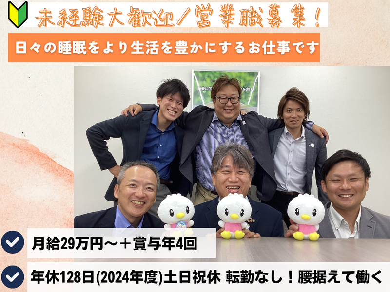 職種/仕事内容 | 仕事内容 寝具の販売を通じてお客様の睡眠をサポートするお仕事! ⭐知識もキャリアも同時に手に入る⭐ 睡眠に関して学びながら働けますよ♪ 「睡眠健康指導士」資格も取得可能です -------------------- ⭐快眠生活アドバイザーとは -------------------- <睡眠の質を向上>を目的として、 お客様一人ひとりに合わせた睡眠のアドバイス、 お悩みに合った寝具の提案・販売も行います。 睡眠に関する知識のニーズは、 近年高まりつつあるんです -------------------- ⭐働きやすさの理由 -------------------- ✅基本飛び込み営業ナシ! 多くは既存のお客様とのお取引なので アポイントが取りやすく安心です◎ ✅週休二日制(土日)祝 128日休み(2024年実績) 休日がしっかり確保できるので ゆっくり休めてプライベートも充実☆ ✅未経験でも活躍できる 丁寧な研修があるので安心して働けます! さらに経験に関わらず月給29万円start★ ✅転勤なし 地元で活躍したい方に朗報! 当社は転勤無しです! ✅福利厚生が充実! ライフプラン手当や住宅手当、食事手当など 従業員の働きやすい環境を整えています! -------------------- このように働きやすい条件が充実✨ 未経験のアナタもぜひご応募ください。 -------------------- 【具体的な仕事内容】 学校や病院、官公庁、介護施設などを訪問して、 その職場で働く職員の方へ向けて、 自社商品のPR・販売をしていただきます。 <紹介は1日2件程度> ■1日の流れ■ 営業所に出社(現場への直行も可) 前日の振り返りや情報共有、ミーティング ▼ 営業に出発/アポイントは1日2~3件 ▼ 営業終了後は、 当日の業務内容をiPadに記録します ▼ 業務終了! 未経験でもスタートしやすいお仕事です。 実際に弊社では、未経験から始めた スタッフが多数活躍しています! 焦らずゆっくり慣れていき、長く安定して 続けられるのがこのお仕事のポイント◎ 働きやすさにはきちんと理由があります✨ -------------------- 【安心のフォロー環境】 当社では、入社後にOJT研修をご用意! 現場では先輩から直接指導を受けられるので、 営業の経験がない方もご安心ください! 先輩がサポートし、一緒に営業活動を行うことで、 段階的にスキルを身につけることができます。 実際に業界未経験入社の先輩たちがたくさん活躍しています! -------------------- 【当社について】 当社は、寝具業界のパイオニアである 「東洋羽毛工業株式会社」のグループ企業として、 四国・中国地方を中心に快眠を支える製品を提供しています。 東洋羽毛グループは1954年創業の老舗羽毛寝具メーカーで、 全国に営業拠点を持ち、 医療や官公庁、教育機関等にお勤めの職員の方に向けて、 確かな品質と地域密着型の営業スタイルで、 職員の皆様の健康と快眠をサポートしています。 【東洋羽毛の魅力って?】 ・以前勤めていた会社より給料が良い。 ・規則がしっかりして、職場環境が良い。 ・ブランドに信頼がある。 ・食事手当や住宅手当など働きやすい制度がある。 ・入社後の教育体制が整っている。 【東洋羽毛をひと言でいうと?】 ・成長していく会社。 ・働きやすい会社。 ・家族との時間を作れる会社。 ・従業員にやさしい会社。 -------------------- 【よくあるご質問(Q&A)】 Q.営業未経験でも大丈夫でしょうか? A.未経験でも問題ございません。 商品の研修や営業活動における研修など 未経験でもしっかりと活躍できる環境を整えています。 【東洋羽毛ってどんな会社】 【先輩インタビュー①】 わからない事があれば質問でき、 いつでも周りがフォローしてくれる会社です。 入社時は、私も営業の知識がほとんどなく、 右も左もわからないような状態でした。 しかし、上司、先輩方にわからないことを 質問すると一つ一つ丁寧に教えてくださり、 一人で悩みを抱え込むということがありませんでした。 基本土日祝が休みなのでワークライフバランスも充実しています。 【先輩インタビュー②】 地元で働きたいという思いが強く、 転勤のない職場を探していました。 東洋羽毛中四国販売は地域密着型の営業スタイルで、 地元で長く働ける環境が整っていたのが決め手です。 入社後は、 土日祝休みで年間休日128日という働きやすさに驚きました。 家族と過ごす時間が増え、 子どもとの時間も大切にできるようになりました。 仕事と家庭の両立がしやすく、安心して働けています。 |