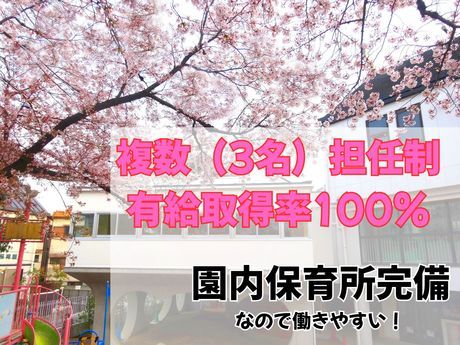 職種/仕事内容 | 仕事内容 【仕事内容】 【0~2歳の小規模保育園|保育士】 ◎定員19名の0~2歳の通う小規模保育園です。 ◎主な仕事内容 ・教育・保育計画の作成と実施(年間・月間・週案など) ・子どもの生活援助(着替え・食事・排泄などの見守り) ・行事やイベントの企画・準備・運営 ・保護者との連絡・面談・連絡帳の記入など家庭との連携 ★当園の特徴★ ◎複数担任制で安心の保育体制◎ →担任2名+保育補助1名の3名体制で、子どもたち一人ひとりにしっかり向き合える環境です。 製作物や行事準備などはパート職員がサポートしてくれるので、担任業務に集中しやすいのもポイント♪ ◎ICTを活用した業務効率化を推進中◎ →月案・週案・日誌などの書類作成はICTシステムを導入しており、手書きの負担を軽減◎ 職員同士の情報共有や事務作業もスムーズになり、保育に集中できる時間がしっかり確保されています! ◎産休・育休の取得実績100%!復帰後のサポートも充実◎ →これまでの取得実績は100%で、復帰率も非常に高い職場です。 復帰後は短時間正社員として働けたり、お子さまの体調不良による急なお休みにも柔軟に対応できる体制を整えています。 ◎関西初!国際バカロレア(IB)認定校◎ →国際バカロレアとは、子どもたちが「自ら考え、学び、探究する力」を育む国際的な教育プログラムです。 当園では、IB認定園として他にはない探究型カリキュラムを実践しており、保育者にとっても日々学びの多い環境が整っています。 ★こんな方にオススメ★ ・企業主導型保育園を併設しており、小さなお子さまがいる方も安心して働けます!(月額:15,000円) ・有給は時間単位で取得可能◎急なお休みやお子さまの行事にも柔軟に対応できます ・幼稚園・保育園・小規模園・療育など幅広い保育に携わることができ、スキルアップにつながります ・子どもたちの主体性を大切にする探究型カリキュラムに興味がある方 ・ICTを活用した働きやすい環境で、業務の効率化を図りたい方 ・行事準備の負担を減らしながら、子どもとの関わりを大切にしたい方 ・チームで連携しながら保育を行いたい方(複数担任制・サポート体制あり) ・ライフステージが変わっても、長く保育の現場で働き続けたい方(育休復帰後の働き方も柔軟♪) 【施設概要】 定員:19名 開園時間:7:30~18:30 【お仕事のポイント】 【おすすめポイント◎】 ◎働きやすさ◎ ・複数担任制なので、安心して保育できます! ・開園時間が7:30~18:30で働きやすい◎ ・ブランクがある方でも大歓迎! ・残業・持ち帰り仕事なし!活動準備はパート職員がサポートしてくれるので安心です◎ ◎待遇・福利厚生など◎ ・産休育休の取得率は100%!安心できる環境で長く勤める事が出来ます! ・職員の昼食も子どもと同じ給食で、準備する必要なし! ・有給取得率は100%◎連休取得も可能◎ ・有給休暇は時間単位で取得OK◎急な体調不良にも柔軟に対応可能! ・お盆休み:8/13~8/15・年末年始休み:12/29~1/3 ・企業主導型保育園が併設されており、預ける事が出来ます。(月額:15,000円) ◎働く環境など◎ ・2025年にオープンしたばかりの新しく綺麗な施設です! ・ICT導入で業務の効率化を実現◎書類等はパソコンを使って作成♪ ・20代~60代と幅広い年齢の方が在籍しており、先生の数も多いので周りと助け合いながら働けます。 ・少人数で関わるので落ち着いて保育ができます! ・新園OPEN予定あり◎オープニングスタッフとして関わりたい方も今から安心! ☆園見学だけでもOK♪まずはお気軽に雰囲気を見に来てください! 1576804 |