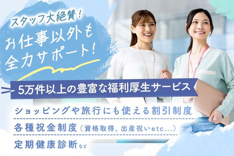 待遇・福利厚生 | 【保険制度】 雇用保険、労災保険、健康保険、厚生年金 【福利厚生】 待遇・福利厚生 【福利厚生】 \5万件以上の豊富な福利厚生サービス/ ◆各種社会保険完備 ◆有給休暇制度 ◆定期健康診断 ◆年末調整 ◆福利厚生施設 ◇マタニティーお祝い制度 ◇出産お祝い制度 ◇育児・介護補助制度 ◇資格取得お祝い制度 ◇結婚お祝い制度 ◇住宅購入お祝い制度 その他… ●スポーツクラブ・映画割引サービス ●ショッピング・グルメ・レジャー施設割引など お仕事だけでなく、余暇も全力サポート♪ |