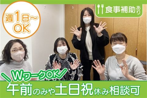 勤務時間 | 変形労働時間制 勤務時間 9:00~13:00(休憩なし)、9:00~15:00、9:00~16:00、9:00~17:00(休憩60分) ※7:00~20:00の間で勤務時間は相談できます ※土日祝お休み相談可 ※勤務日数相談可 |