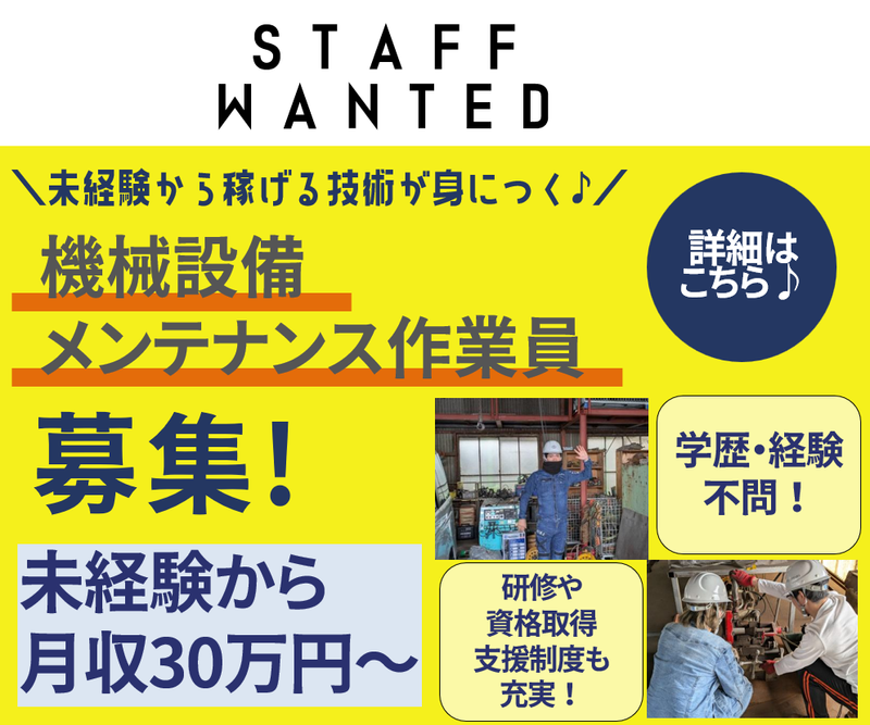 職種/仕事内容 | 仕事内容 ━━━━━━━━━━━━━━━━━━━ ⭐20代~50代の方が幅広く活躍⭐ 未経験からしっかり稼げる技術が身につく♪ ━━━━━━━━━━━━━━━━━━━ ⭐【求人のポイント!】⭐  ̄ ̄ ̄ ̄ ̄ ̄ ̄ ̄ ̄ ̄ ̄ ̄ ̄ ̄ ̄ ̄ ̄ ̄ ̄ ✅「そろそろ、安定した仕事で家族を安心させたい」 ✅「地元に就職、手に職をつけて長く働きたい」 ⇒そんなあなたを【育てる前提】で迎えます! ⭐【仕事内容】⭐  ̄ ̄ ̄ ̄ ̄ ̄ ̄ ̄ ̄ ̄ ̄ ̄ ̄ ̄ ̄ ̄ ̄ ̄ ̄ 化学工場やプラントなどに、機械を“据え付ける”仕事です。 分かりやすく言うと「大きな機械の修理屋さん」のような役割。 • 扱うのは、搬送装置・製造機械など • 複数名のチームで行うので、未経験でも安心 • 「動かす・運ぶ・設置する・締める」など体を動かす作業が中心 • はじめは補助作業からスタート! \未経験スタート大歓迎!/ 道具の名前から丁寧に教えます。 ⭐【働きやすさのPOINT】⭐  ̄ ̄ ̄ ̄ ̄ ̄ ̄ ̄ ̄ ̄ ̄ ̄ ̄ ̄ ̄ ̄ ̄ ̄ ̄ ✅ 未経験からのステップアップOK ┗「資格取得支援制度」あり。資格取得費用は会社負担◎ 玉掛け・フォークリフト・溶接など、将来に活きるスキルが身につく! ✅全国各地を旅行?!出張制度の充実 ┗出張中は宿泊費と食事代を会社負担、かつ出張手当もあり◎ ⭐【作業内容について】⭐  ̄ ̄ ̄ ̄ ̄ ̄ ̄ ̄ ̄ ̄ ̄ ̄ ̄ ̄ ̄ ̄ ̄ ̄ ̄ 工具を使った手作業での修理・メンテナンス作業が中心です。 •スパナを使って、機材のボルトを締める •既存パーツを使い、数日かけて機械を組み立てる •機材を溶接する など。 何かを組み立てたりの作業が好きな方にはピッタリ! 現場での不安がないように入社してから1か月を目安に研修を行っています。 道具の名前、使い方等社長直々に丁寧にお教えしますので未経験者でも安心して働くことができます! ⭐【1日の流れ】⭐  ̄ ̄ ̄ ̄ ̄ ̄ ̄ ̄ ̄ ̄ ̄ ̄ ̄ ̄ ̄ ̄ ̄ ̄ ̄ 8:00~8:30 朝礼 8:30~10:00 作業開始 10:00~10:30 休憩30分 10:30~12:00 作業 12:00~13:00 お昼休憩1時間 13:00~15:00 作業 15:00~15:30 休憩30分 15:30~17:00 作業して終了!残業ほぼなし! ⭐【入社後の流れ/研修内容】⭐  ̄ ̄ ̄ ̄ ̄ ̄ ̄ ̄ ̄ ̄ ̄ ̄ ̄ ̄ ̄ ̄ ̄ ̄ ̄ ✅OJTではなく研修からスタート! 付きっきりで1から教えていきます! ・道具の名称、使いどころ ・使い方のレクチャー ・安全意識講習 まずは道具の名前から!工場に100種類ほどある道具ですが、一気に全部は無理なので優先度の高い道具から順番に教えていきます。メインの約50種類ほど覚えられればまずはOK。しっかり覚えきるまでは2か月ほどを予定してます!その間に現場にも出向き、実際の使い方も見て覚えてもらいます。 ✅3か月目からは現場で先輩社員とOJT! 先輩社員の同行がない現場にはいかないのでご安心を。 資格取得も並行して進めることができるので腰を据えてステップアップすることができます! ✅一人立ちまで約5~6年です。 未経験からしっかり稼げる技術が身につく環境です! ⭐【出張について】⭐  ̄ ̄ ̄ ̄ ̄ ̄ ̄ ̄ ̄ ̄ ̄ ̄ ̄ ̄ ̄ ̄ ̄ ̄ ̄ 九州(福岡・佐賀)や、千葉、仙台、など、全国に出張拠点があります。 各地の一つの拠点(工場)で、数週間~1ヶ月ほどかけてコツコツ作業をしていきます。 1人で出張作業をするのではなく、4~5人のチームで作業をするのでご安心ください。 出張中はもちろん、宿泊費(1人部屋のビジネスホテル等)と食事代を会社負担します。 また出張手当も支給!貯金もしっかり貯めることができます! ※出張をしない働き方も可能ですので、 出張にいきたい、地元で働きたいなど希望を伝えてください! ⭐【社員構成】⭐  ̄ ̄ ̄ ̄ ̄ ̄ ̄ ̄ ̄ ̄ ̄ ̄ ̄ ̄ ̄ ̄ ̄ ̄ ̄ 現在社員は8名です!様々な年代が活躍! 社長も現場で教えてくれたり、 先輩達も困りごとがないか等、よく声を掛けてくれるので、 人間関係にも困りません! (構成) 20代/2名 30代/2名 50代/3名 60代/1名 |