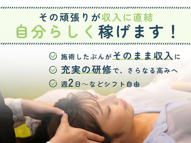 給与 | 時給1,920円~5,000円 給与 時給 1,920円~5,000円 ※上記は1時間単位の収入の目安です。 ※報酬額は施術1件ごとの インセンティブ(50%バック)+指名料(100%バック) で決定します。 ※指名料はご自身で決定できます。 ※場所代として施術一件ごとに 売上の10〜15%を差し引きます。 \\昇給あり// ・固定のお客様が増えた ・会社に貢献した などの場合は報酬額UP! |
