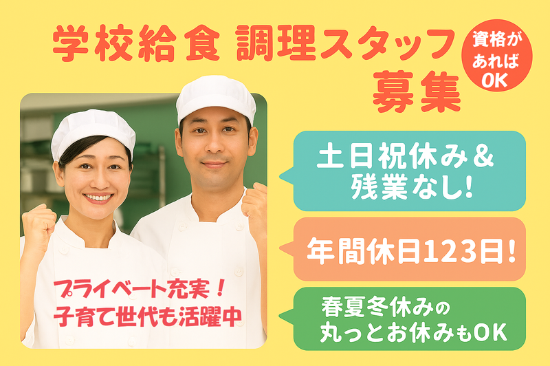 職種/仕事内容 | 仕事内容 完全、土日祝休みの正社員 ⭐ 年間休日123日+有給休暇 ⭐ ⭐夏休みなど長期休みもお休みOK⭐ 調理師または栄養士の方!! >>正社員での終身雇用です<< 資格はあるけど、実務未経験者も 心機一転したい方の転職も大歓迎! - ⏩面接1回のみ!筆記・実技なし ⏩応募は約1分でカンタン入力 ⏩電話応募も歓迎▶0661529061 創業60年以上の当社だから、長く勤務いただける職場環境に自信があります! 中途入社のハンデはありません。 ✅ボーナスは年2回支給! ✅交通費は全額支給! ✅本部に申請なしで有給取得OK ✅65歳まで雇用延長可。退職金もあり! ✅完全無料のおいしい給食付き! ✅春夏冬休み中は連休も取りやすい♪ →まるっとお休みすることも可能です 【仕事内容】 大阪市西淀川区の御幣島小学校内の給食室で、約930食の給食調理全般と食材管理をお願いします。 野菜の洗浄、カット、調理、調味料計量、クラス毎の区分けなどを分担して作業するので、給食調理未経験者も安心! ✨栄養士の方も献立作成はありません。 ✨白衣、帽子、マスクなど全て会社負担。就業前の準備は不要 ✨個人で洗濯の必要なし! ──────────――――――――― 経験により開始月給から優遇します ──────────――――――――― 実務経験ある方は給与優遇! 学校給食、幼保育園、病院福祉施設、社員食堂などの経験者大歓迎です。 飲食店からの転職者もたくさん活躍中! ⏩「自分の経験だといくら位?」など面接時に気軽に聞いてください。 ┏━━━━━━━━━━━━━━━┓ ┃ 単独校調理経験者は、必⾒︕ ┃ ┃ >> 経験2年以上の方 << ┃ ┃✨開始⽉給27万円まで優遇可✨┃ ┗━━v━━━━━━━━━━━━┛ ⾃校式給⾷の調理経験がありましたら ぜひ面接時に教えてください。 ──────────――――――――― 当社運営の給食室では、男女とも活躍中 ──────────――――――――― ⏩16時半終業、残業なし ⏩平日休みも取りやすい環境です ⏩⼦育てママも無理なく活躍中 「⼦供が感染症などにかかってしまったら1⽇休みでは済まないかも…」と不安な方も安心してご応募ください! ➡衛⽣上の体調不良で⾃宅待機をお願いした場合も、条件によって給与の6割を保証しますので安⼼・安定して勤務いただけます。 ──────────――――――――― イートランド株式会社について ──────────――――――――― 当社は「食」に携わる事業を多岐に展開する会社。 栃木県宇都宮市で創業60年以上! 総スタッフ数は3000人! 全国の学校給食室・社員食堂・病院給食室などを運営しています。 関西事業所のスタッフがサポートします。 |