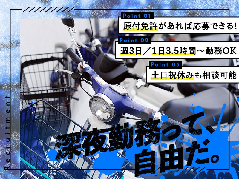 勤務時間 | シフト制 勤務時間 0:30~4:00(実働3.5時間) ※休憩や配達スピードにより異なります ⇒週3日からOK! |