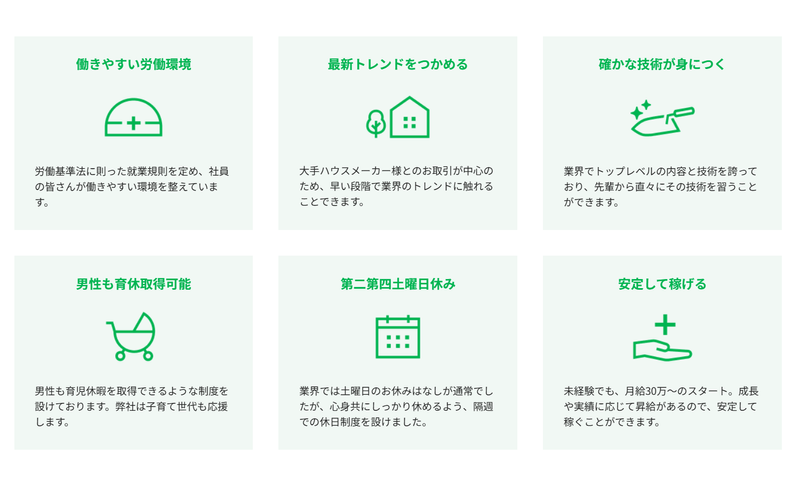 職種/仕事内容 | 仕事内容 新築住宅を魅力的に演出する最後の仕上げ!外構工事(エクステリア)を担当いただきます。 <仕事内容> ・建物を囲うブロック積み ・駐輪場の施工 (自転車置き場の工事) ・カーポートの設置 (駐車場の屋根設置) ・生コンクリート打設 ・目隠しフェンスの設置 ・境界フェンスの設置 ============== 外構工事のココが面白い! ============== 施工を担当する住宅によって工事内容が変わるのが面白いポイントです。 例えば、ブロック塀を積み上げるだけの工事もあれば、フェンスを取り付けたり、カーポートを設置したり、庭を作ったりと様々。 私たちが担当するエクステリア(外構工事)は、住宅の表情を作る仕事でもあるため、完成した時に良い顔つきの住宅が出来上がると喜びはひとしおです! =============== 20代・30代・40代活躍中! =============== 未経験から入社して、道具の名前や使い方、材料の知識を身につけていったメンバーが今、主力として活躍しています。 先輩のサポートから入って、少しずつ簡単なことから仕事を担当して覚えていくので、一つずつできる仕事を増やしていくことができます。 わからないこと、知りたいことは遠慮なく聞いてください。あなたの成長が先輩たちの喜びなので、丁寧に教えていきますよ。 ================== 育休あり!男性社員取得実績あり! ================== 当社では、育休取得を推奨しています!会社として力を入れている取り組みだから、取得しやすいのが自慢です。 実際に、男性社員はこれまで2名の取得実績があり、そのうち1名は現在も育休中! 最長で1年間の育休取得が可能でから、夫婦揃って子育てに入れる環境が整っています。 =================== 高い給与水準と年収でお迎えします! =================== 未経験からスタートする方も将来を見据えて働けるようにスタート給与は「月給30万円以上」!業界内でも高い給与水準でお迎えします。 また、賞与は年3回と社員に収入面での還元を大切にしているから、年収も水準以上!安心できる収入を得られるから働くモチベーションにも繋がりやすい環境です。 その他にも退職金制度を設けるなど、安定した経営基盤があるから福利厚生が充実しています。これも経営陣が常に会社の制度や働きやすさを追求している証!だから定着率も良好です◎ ================= 土日休みでプライベートも満喫! ================= 業界的に日曜休みと祝日がお休みがほとんどの中、当社では隔週で土曜休みを取得できる環境を整えています。 そのため、土日の連休取得が可能になるので、プライベートの予定も立てやすいのが魅力です! 好きなことに時間を使うことも、大切な人と過ごす時間に充てるのも、ゆっくり体を休める時間にすることもできます。 ============= HPもぜひご覧ください! ============= https://grand-tech.co.jp/ |