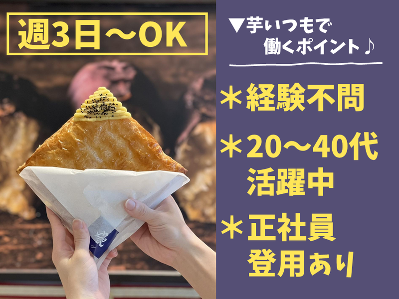 対象となる方 | 求めている人材 <未経験者歓迎・無資格歓迎> サポート体制万全でお待ちしております! -------------------- *学歴不問・経験不問 *ブランク歓迎 *主婦・主夫歓迎 <こんな方歓迎> *お芋スイーツが好き *おしゃれなお店で働きたい *接客経験を活かしたい *スイーツをつくることが好き・得意 <以下の有資格者・経験者歓迎> 【接客業】 飲食店勤務 (レストラン・カフェ・居酒屋など) レジスタッフ (スーパーマーケット、コンビニ) ホールスタッフ、アパレル販売職、 販売スタッフ 【サービス業】 ホテルフロントスタッフ、 ウエディング関連、結婚式場スタッフ、 ブライダルアルバイト、セレモニースタッフ 【調理・食品製造】 キッチンスタッフ、調理スタッフ 調理補助、調理師免許、給食調理 工場作業員、工場内作業 「久しぶりのお仕事」という方も応募OK! 業務をしながら勘を取り戻せるよう、 サポート体制は万全ですので、ご安心を。 <こんなスタッフが活躍中> 美味しくて安全なお芋スイーツを お客様へお届けしたい! そんな想いからスタッフは全員 「タバコを吸わない」ことを徹底し、 ニオイを含め衛生面には 特に気をつかっています! |
