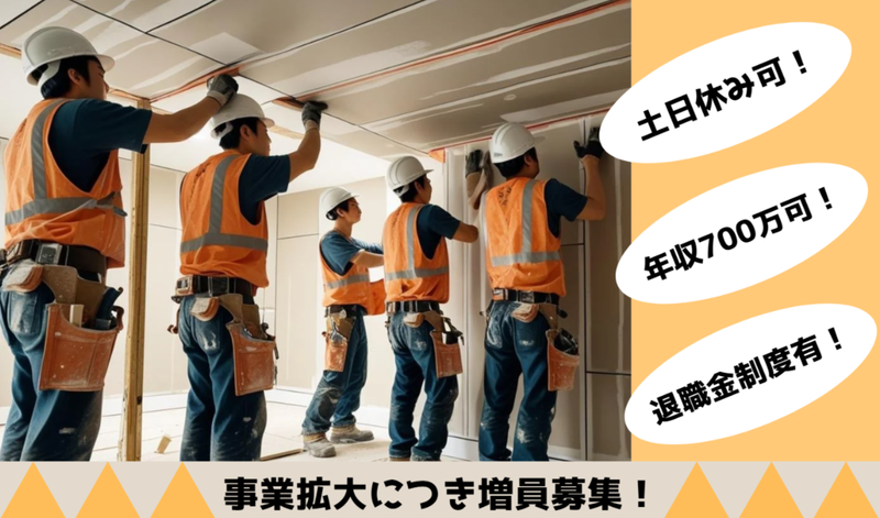 職種/仕事内容 | 仕事内容 ✨業界未経験OK!経験を活かしたい方も◎ ✨OJT制度で一人一人丁寧に教えます ✨基本土日休み!年間休日114日! ✨賞与有♪しっかり稼げる月給30万円~ ✨年収700万円以上も可! ✨現場は様々ですが、一緒に働く関係会社さんはいつも一緒なので慣れた環境で働けます! ✨事業拡大に向けた増員募集!管理職へのキャリアアップも最短で叶います。 ✨残業ぼぼなしなので無理なく働ける♪ ◇具体的な仕事内容  ̄ ̄ ̄ ̄ ̄ ̄ ̄ ̄ ̄ ̄ ̄ ̄ ̄ ̄ ̄ ̄ ̄ ̄ ̄ ビジネスホテル・レジャーホテル・ 店舗等を対象に、以下の業務を お任せします。 ✅改装 ✅新築工事の設計 ✅積算 ✅施工管理 ✅発注先との打ち合わせ ✅その他付随する業務 ☆入社後はOJT制度で同じ日本人の 先輩社員が担当で 1人ついて業務を教えていきます。 いきなり1人で何かを任せたり することはないため、 初めての方でも始めやすい環境が 整っていると思います! ☆未経験の方やブランクがある方、 現場系のお仕事が少ししかない方も ご安心ください! ☆未経験からスタートしても、 働いていくうちにお仕事に慣れてきたら いずれは現場の業務というより、 より経営に近い管理職ポジションを 目指すことも可能です! ■■■■■この求人のポイント■■■■■■ ⭐現場は様々ですが、 一緒に働く関係会社はいつも一緒なので 慣れた環境で働けます! ⭐創業メンバーから独立したメンバーも! 経営層・独立を目指すことも可能♪ ⭐事業拡大に向けた増員募集! 管理職へのキャリアUPも最短で叶う! ⭐年収700万円以上も可! 頑張りはしっかりお給料でも反映あり♪ ⭐基本土日休みで年間休日は114日! プライベートも充実できます♪ ■■■■■■■■■■■■■■■■■■■■ ◇社員インタビュー  ̄ ̄ ̄ ̄ ̄ ̄ ̄ ̄ ̄ ̄ ̄ ̄ ̄ ̄ ̄ ̄ ̄ ̄ ̄ 働く環境としてはとても働きやすいです。 各現場で一緒に働く関係会社さんは いつもほとんど同じ顔ぶれなので、 慣れた環境で働けるところがいいです。 また、仕事とプライベートをメリハリ つけて働けるところも気に入っています。 未経験や無資格からでも 何か目に見えるものを作ることに 携われるというのは、お仕事のやりがいや おもしろさにつながっています! ◇会社について  ̄ ̄ ̄ ̄ ̄ ̄ ̄ ̄ ̄ ̄ ̄ ̄ ̄ ̄ ̄ ̄ ̄ ̄ ̄ 内装工事といえば、大半は数百万から 数千万規模の案件が多いですが、弊社でも 億単位の案件や現場に携われるため、 今後の独立を見据えてだったり、 会社の上席を目指す上での貴重な経験を 積んでいただくことが可能です。 実際に弊社の創業メンバーで 独立を果たした者もいます。 一方で、金額が大きくなる分、 高いスキルが必要であったり、 大きな責任が伴うのではと心配になる 部分もあると思います。 当社はベテラン社員が多く、 まずは先輩社員の補佐など学ぶことから 入っていただいて大丈夫です。 |