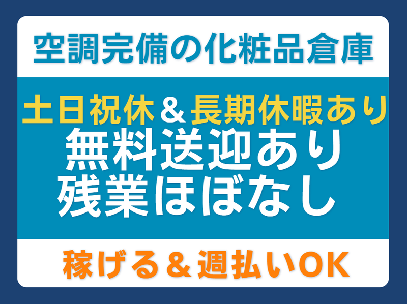 職種/仕事内容 | 仕事内容 \ 未経験者歓迎!働きやすさ抜群! / 空調完備の快適空間で、ストレスフリー! 【 具体的には 】 有名ブランドの化粧品を扱うキレイな倉庫で、商品を種類ごとに仕分ける作業が中心です。 *商品の入荷をリストを元にチェック *商品ごとに積み込み作業 *仕分け作業 等々 もちろん、不安も多くあるかと思いますので、サポート体制も整えております。 扱うのは、化粧水などが入った段ボール箱(1ケース5kg程度)。 重量感のある商品も一部ありますが、長時間持ち続けることはないので、無理なく働くことができます。 その箱をリストを見ながらパレットに積み替えたり、棚へ補充したりします。 立ち仕事や、商品を運ぶ作業が中心なので、「デスクワークより、適度に体を動かす仕事が好き」という方にピッタリです! 【この職場のイチオシPoint!】 ✅ プライベート最優先!<土日祝休み&残業ほぼナシ> 週末はしっかりお休みで、平日の仕事後も自分の時間たっぷり!GWやお盆、年末年始の長期休暇もあります。 ✅ 通勤ラクラク!<駅からの無料送迎バスあり> 「市川塩浜駅」「妙典駅」から快適な送迎バスが出ています。もちろん車・バイク通勤もOK(無料駐車場完備)! ✅ 働く環境は最高レベル!<空調完備&豪華な休憩室> 一年中快適な空調完備の倉庫です。休憩室はコンビニ・社員食堂完備! 【 安心のサポート体制 】 面接から貴方をサポートするのは、株式会社エムズラインのスタッフ。全員が実際に作業員として、勤務していたスタッフです。ルールを順守し、貴方が安心して勤務できるようにします◎ 【安定的な勤務が可能です!】 *SGホールディングスのグループ会社です、 *派遣社員経験のない方もご安心ください、違法な雇止めなど不利になるような雇用は致しません |