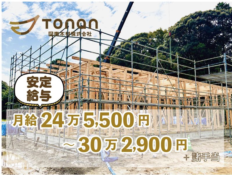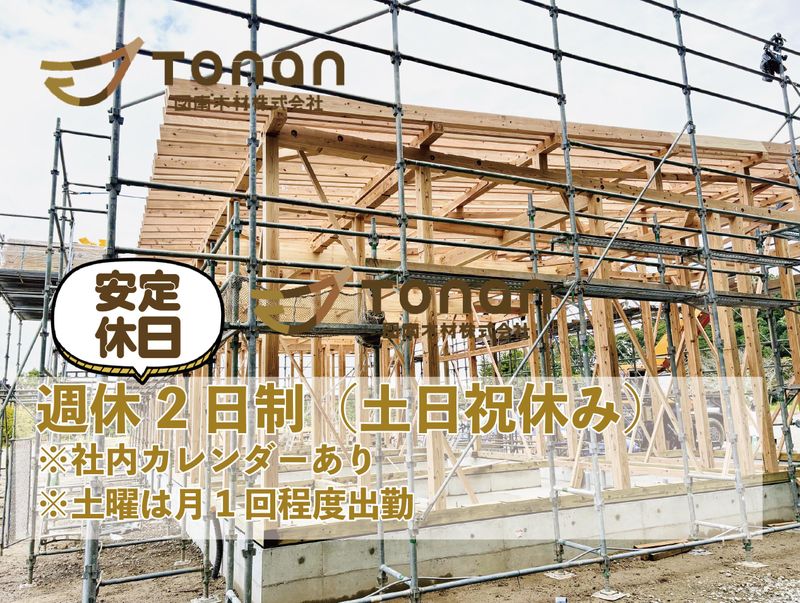 職種/仕事内容 | 仕事内容 〈図南木材で働くおすすめ3つのポイント〉  ̄ ̄ ̄ ̄ ̄ ̄ ̄ ̄ ̄ ̄ ̄ ̄ ̄ ̄ ̄ ̄ ̄ ̄ ̄ ̄ (1) 20〜30代も主力メンバーとして活躍中の職場 #同年代の仲間が多く、相談しやすい雰囲気です。 (2) 未経験でもプロの大工スキルが身につく #道具の名前から教える研修+資格取得支援あり。 (3) 正社員として安定勤務 (土日祝休み/賞与年2回/年休110日) #建設業では珍しい「安定」と「成長」を両立。 〈今回の募集背景〉  ̄ ̄ ̄ ̄ ̄ ̄ ̄ ̄ ̄ ̄ ̄ ̄ ̄ ̄ ̄ ̄ ̄ ̄ ̄ ̄ 図南木材は、創業80年の木材商社として 新しく“建方専門チーム”を立ち上げました。 今回募集するのは、木造住宅の骨組み (柱・梁・屋根)を組み上げる組立スタッフです。 未経験から手に職をつけたい方、単純作業 ではなく“考える現場仕事”をしたい方に最適です。 チーム立ち上げ期のため、 私たちは「全員面接」の姿勢でできるだけ 多くの方とお会いしています。 経験よりも意欲や人柄を大切にした採用を 行っています。 〈仕事内容:家づくりの“骨組み”をつくる仕事〉  ̄ ̄ ̄ ̄ ̄ ̄ ̄ ̄ ̄ ̄ ̄ ̄ ̄ ̄ ̄ ̄ ̄ ̄ ̄ ̄ 木造住宅の土台・柱・梁・屋根まで、 プレカット材を使って組み上げる仕事です。 加工は工場で行うため、現場では組立と調整が メイン。未経験でも始めやすい工程です。 ▼主な作業 ・土台敷き ・柱・梁の組立 ・屋根部分の組み上げ ・外壁パネルの取り付け ・現場状況に合わせた調整作業 ▼チーム体制 ・自社4名+協力大工を含む7〜8名 ・30坪の住宅なら4〜5日で屋根まで完成 ・月2〜3棟を担当(体制増強後は3〜4棟も可能) 【チームの特徴】 ・20代〜30代が中心となり現場をリード◎ ・作業中はこまめな声がけで連携し、 初日から馴染みやすい“風通しの良さ”が魅力◎ 〈この仕事の魅力〉  ̄ ̄ ̄ ̄ ̄ ̄ ̄ ̄ ̄ ̄ ̄ ̄ ̄ ̄ ̄ ̄ ̄ ̄ ̄ ̄ ■ 毎日違う現場で“成長を実感できる” 敷地条件・天候・仕様が毎回異なるため、 段取り力が自然と身につきます。 【スタッフの声】 「毎日状況が違うから、考えながら動けるのが楽しい」 ■ メーカーごとの仕様が学べて専門性が広がる 工務店ごとに構造や工法が違うため、 知識の幅が一気に広がります。 【スタッフの声】 「メーカーごとに仕様が違い、毎回勉強になる」 ■ チームで“やり切る”達成感 常に声を掛け合い、協力しながら進める現場。 雰囲気も良く働きやすい環境です。 【スタッフの声】 「みんなでゴールを決めて動くのが気持ちいい」 ■ 大工では珍しい“正社員の安定” 業界では一人親方が多い中、安定収入・賞与・ 社保完備で働けます。 【スタッフの声】 「正社員として安心して働けるのが決め手でした」 〈図南木材ってどんな会社?〉  ̄ ̄ ̄ ̄ ̄ ̄ ̄ ̄ ̄ ̄ ̄ ̄ ̄ ̄ ̄ ̄ ̄ ̄ ̄ ̄ 創業80年の地域密着型木材商社。建材の販売 から加工・施工まで一貫対応し、工務店・ ハウスメーカーから高い信頼を得ています。 現在は次世代の職人育成にも力を入れ、 未経験からスキルを伸ばせる環境を整備して います。 \ ぜひSNSもご覧ください! / https://www.instagram.com/tonan_lumber/ |