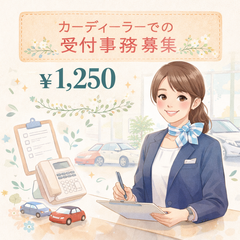 職種/仕事内容 | 仕事内容 【仕事内容】 カーディーラーでの受付事務として、来店されるお客様の対応や事務サポートをお願いします。 接客や事務の経験がなくても研修が充実しているので安心してスタートできます。 <具体的なお仕事> ・来店されたお客様の受付・案内 ・電話対応・予約対応 ・見積書や契約書の作成補助 ・車検・点検などの受付・案内 ・データ入力・書類整理 店内の整備・清掃サポート(簡単な補助作業) 【1日の勤務の流れ】 9:30 始業 12:00 お昼休み 13:00 午後の勤務開始 18:00 終業(来店状況により残業) - 【登録に関して】 ①ご応募を頂きましたら当社にて ご登録をして頂きます。 登録は履歴書不要となり最短で 当日でも可能となります。 ②当社には5カ所の登録会場が ございますので、最寄りの登録会場を ご案内致します。 ③ご応募を頂いたお仕事の ご案内をさせて頂きます。 ④当社担当コーディネーターと 一緒に職場見学をして頂きます。 ⑤職場見学を行い就業が決まります。 ⑥勤務当日は担当コーディネーターが 一緒に出勤を致します。 入社後も不安やお悩みがあれば お気軽にご相談ください。 【特徴】 当社は1990年に創業以降、群馬県・ 埼玉県を中心に人と企業の パートナーとしてお仕事紹介の 架け橋を行っております。 製造系、事務系、接客系等々、 様々なお仕事紹介をしており、 今後も『ありがとう』を派遣する企業で ありたいと思っております。 ご紹介をさせて頂いているお仕事は 常時約200件となり、若年層の方から 中高年やシニア層(40代、50代、60代)の 方、またスキマ時間を利用して アルバイト・パートのお仕事をお探しの 主婦・主夫の方等、幅広く活躍を しております。 |