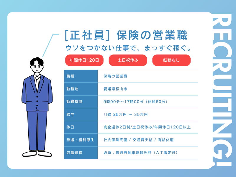 職種/仕事内容 | 仕事内容 【具体的な仕事内容】 ・保険(医療・がん・車・火災など)をご案内するお仕事です ・お客様の要望に合わせて、ぴったりな保険を案内します ・すでにご契約いただいているお客様のサポートや、紹介で新しいお客様にもご提案します 世の中で何千万円と給与をもらう保険の営業がいるのは、お客さんをだましているからではありません。 嘘をつかず、お客さんの要望や人生が叶う提案を行えば、それだけの評価がもらえるのがこの業界です。 条件や仕事内容で、気になっているけど迷っているという方は ぜひ、次の社員の声を読んでください。 気になった方やもう少し知りたいという方は、いきなり面接でなくてかまいませんので、ぜひお問合せください。 【社員の声】 2009年入社 Nさん 経歴 ▼ー ディーラー 整備士 ▼ー ディーラー 営業職 ▼ー 中古車販売 営業職 ▼ー 愛媛ライフ保険 営業職 〈入社のきっかけ〉 ディーラーで勤務していたときのお客さんの中に愛媛ライフ保険で勤務している方がいました。 私がディーラーをやめて中古車販売を始めたころに 「Nさんに中古車販売は向かない、保険屋になれ」と言われました。 最初は断りましたが、そのとき言われた言葉を今でも覚えています。 「保険はお客様が困ったときに寄り添える。保険は値引きができないからどの担当からお願いしても同じ金額で同じ保険に入れる。だからこそ、嘘をつかなくていい。」 この言葉を聞いて、自分に向いているかもと思い、入社を決めました。 〈この会社の良さ〉 仕事にかかることは基本的に経費扱いになる。 まだ駐車場代やガソリン代を手出ししているところもあると聞くので、そこと比べると働きやすいと思います。 また、お客さんに案内するのは、自分たちがうれしい保険ではなく、お客さんがうれしい保険です。 会長も「真面目にコツコツ」を大切にしているので、この考え方は浸透しています |