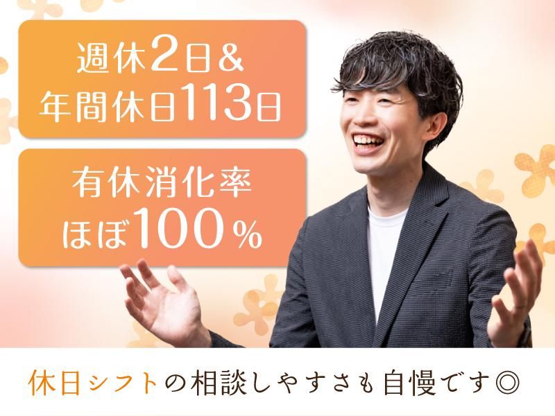 休日休暇 | 休日休暇 【年間休日113日】 *完全週休2日(シフト制/月21日稼働) *長期休暇あり(7日間の連休取得も可) \休日シフトも相談しやすい♪/ 「ここは土日で」「家族旅行で連休を」 など、お休みの希望も相談しやすい! チームワークだからこそ、みんなで 「お互い様」の気持ちを大事に 協力しています。家庭との両立で 共に充実させながら働ける環境作りを 大切にしていますよ^^ 【ほか休暇】 *産前産後休暇 *育児休暇 *介護休暇 *慶弔休暇 *有給休暇(有給消化率ほぼ100%) |